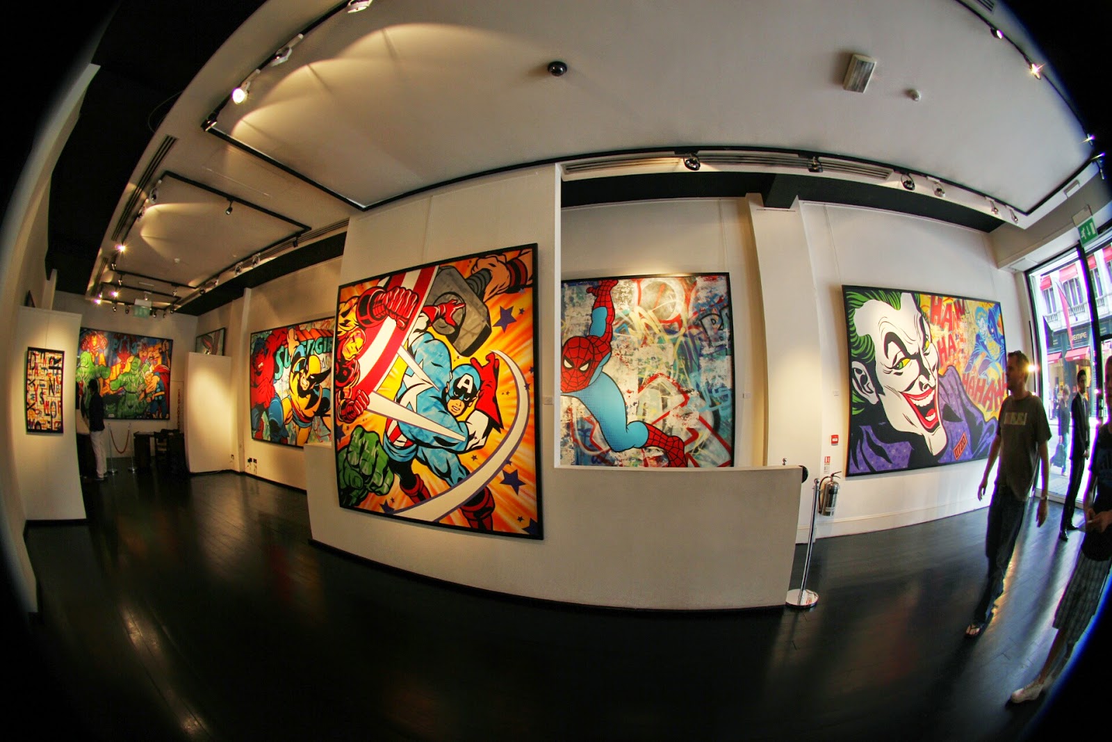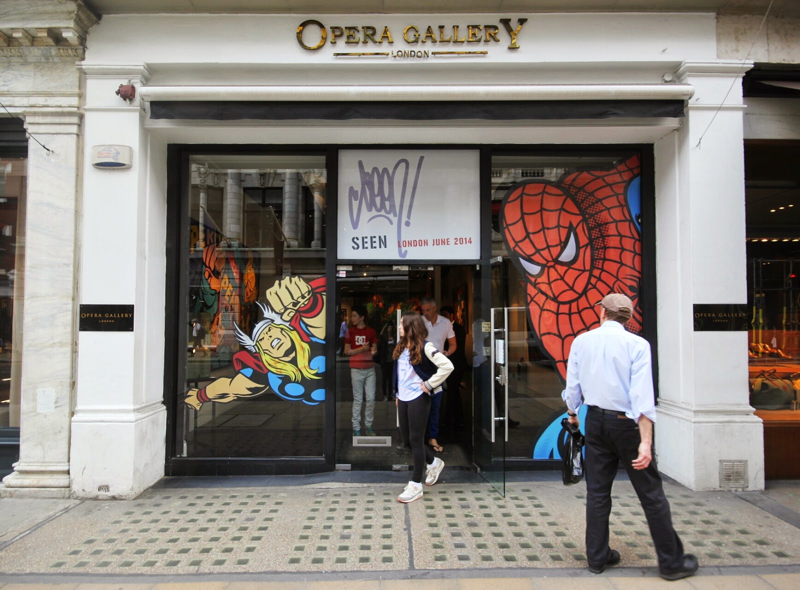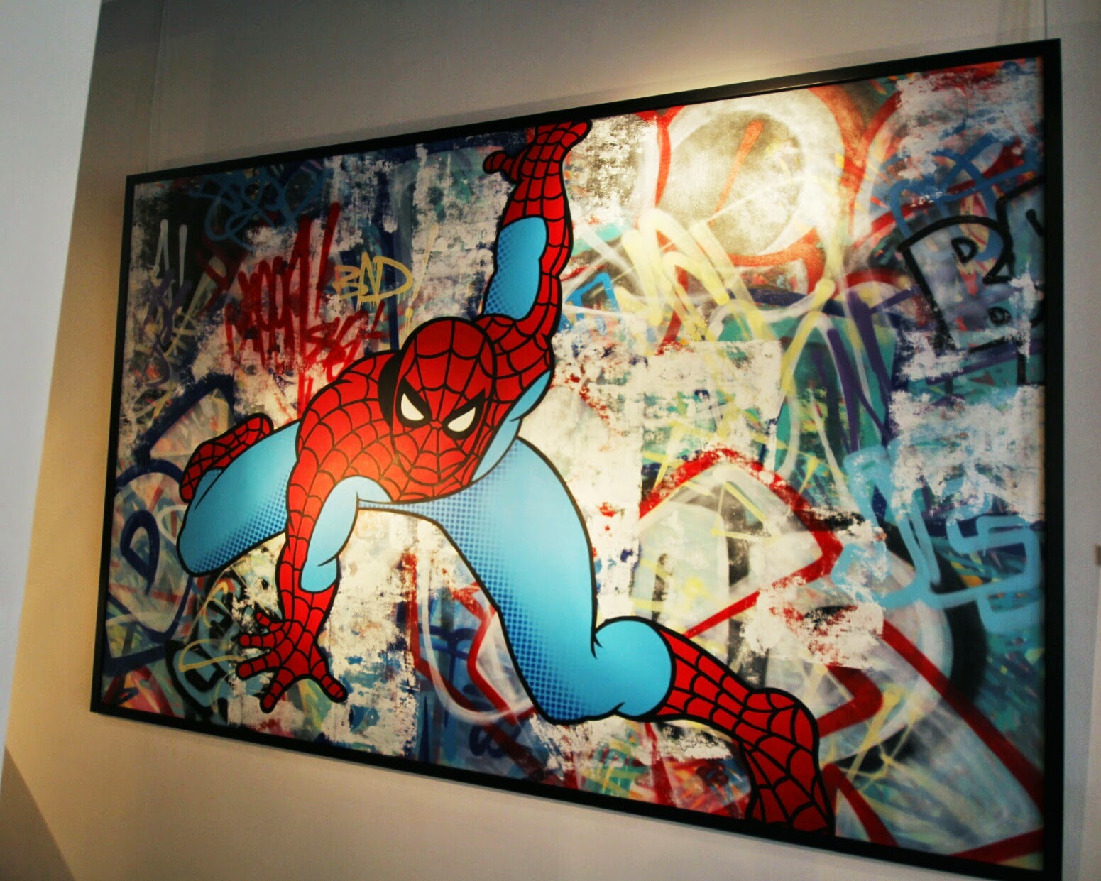 The opening of his exhibition was attended by well known names in the street art/graffiti scene in London including: Stik, Jimmy C, Tizer, Tworise and Dscreet to name a few. For this body of work Seen revisited his childhood and produced large canvases featuring superheroes using stencils and spray paint. In his own words: ‘All these characters are part of my life; I consider them my friends.’