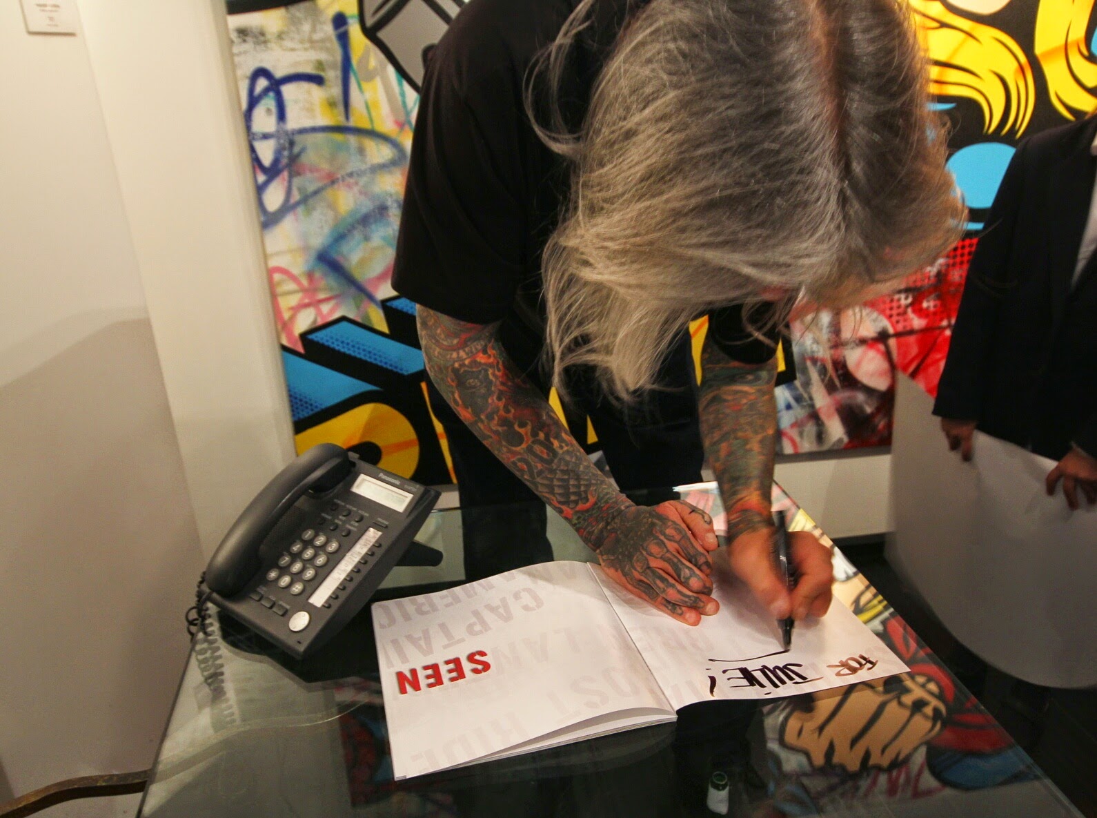 Seen aka Richard ‘Richie’ Mirando was born in 1961 in the Bronx, New York is one of the most known graffiti artists in the world. He is often referred to as the Godfather of graffiti. Seen first started to paint on the New York subway trains in 1973 aged just 12. In the 80’s New York there were more paintings on the streets by Seen than billboards. Instead of just tagging Seen and his crew United Artists or UA painted whole cars. His work travelled through the city and become part of its cultural fabric. After featuring in the 1983 documentary ‘Style Wars’ and in Martha Cooper/Henry Chalfant’s book ‘Subway Art’ in 1984 his work circumnavigated the globe inspiring countless other artists; many still active today. Around this time Seen started to produce canvas work exhibiting along Keith Haring, Andy Warhol and Jean-Michel Basquiat. A genre that began as a form of subversive public communication was becoming legitimate and Seen was at the forefront. In the late 80’s he also turned his talent into tattooing opening ‘Tattoo Seen’ which quickly became one of the most successful tattoo studios in New York.