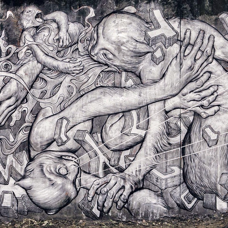 James Jean was invited to participate in the POW! WOW! Taiwan street art festival where he just finished this new piece showing some Taiwanese macaques tumbling in a paradise/prison of man’s making.