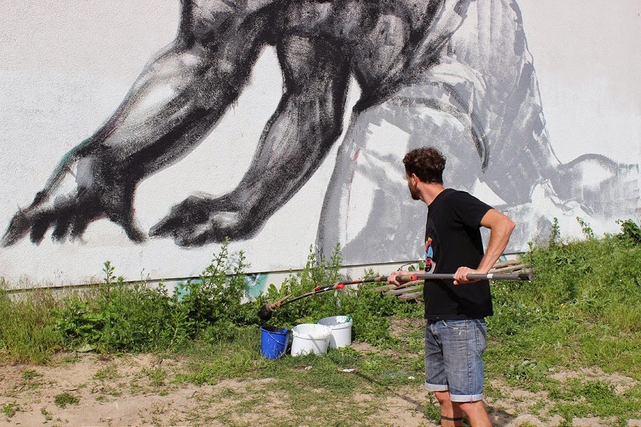 In between creating works specifically made for the gallery space, he painted this impressive mural using just a fat brush and black paint. Showing a massive strong Minotaur arising, this piece looks like enlarged pencil study, and is continuing his ongoing series of works with anamorphic characters.