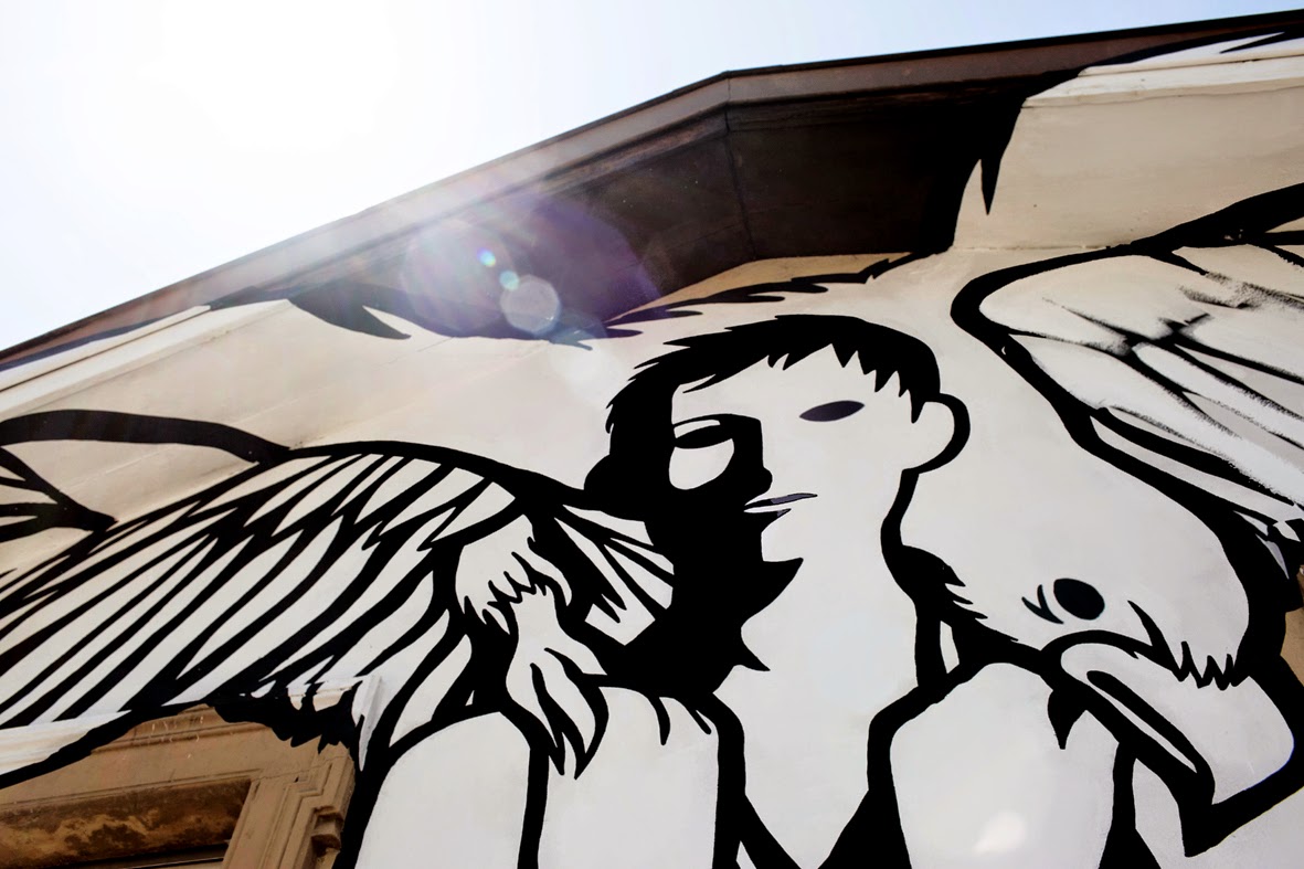 This large-scale mural is entitled “Open God” and is inspired by the greek Myth of Ganymede. Ganymede was abducted by Zeus from Mount Ida. Ganymede had been tending sheep, a rustic or humble pursuit characteristic of a hero’s boyhood before his privileged status is revealed. Zeus either sent an eagle or turned himself into an eagle to transport the youth to Mount Olympus.