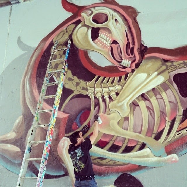 Using spray-paint supplied by Montana, the Vienna-based street artist carefully painted this superb piece showing the insides of his massive horse.