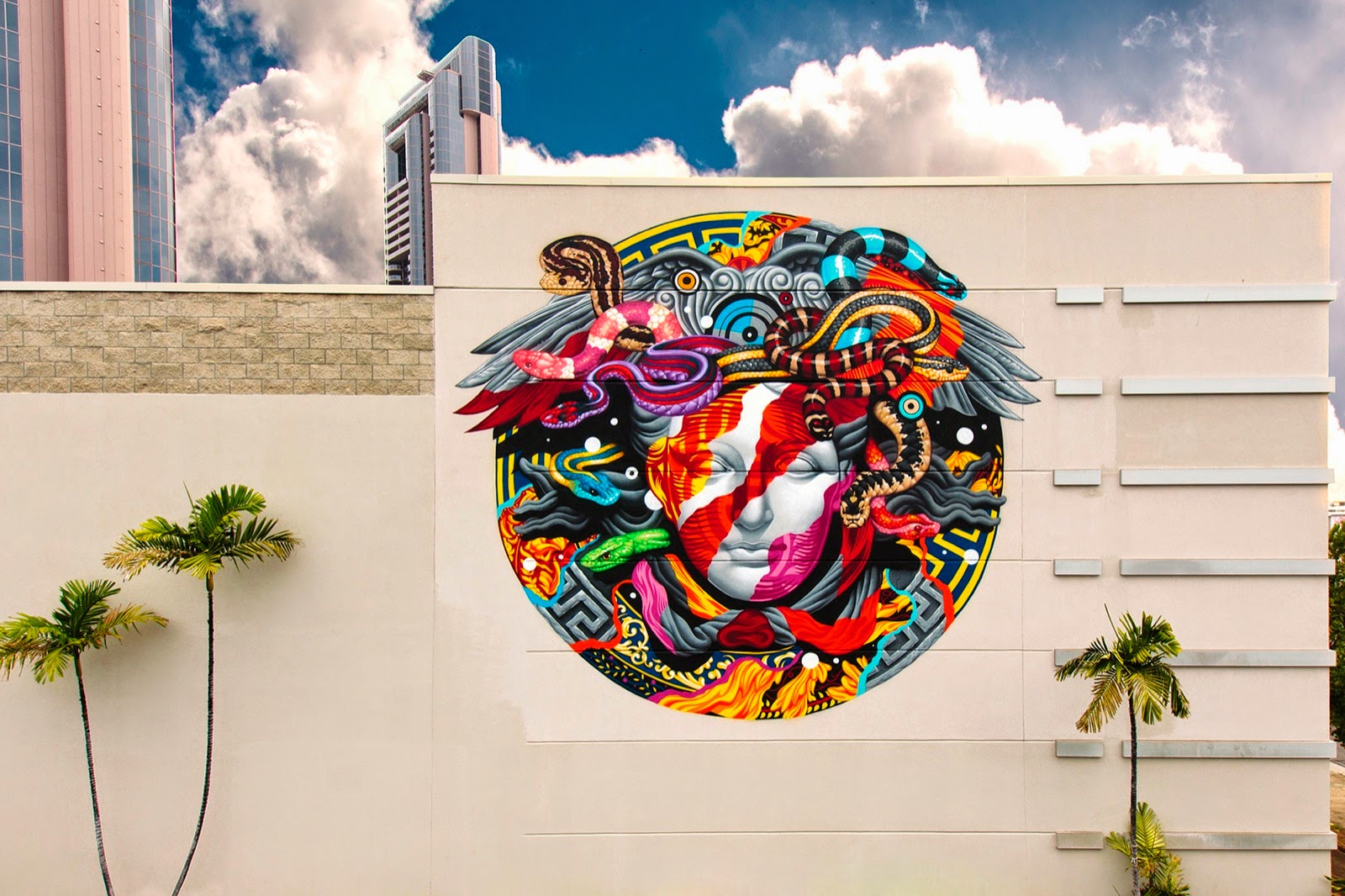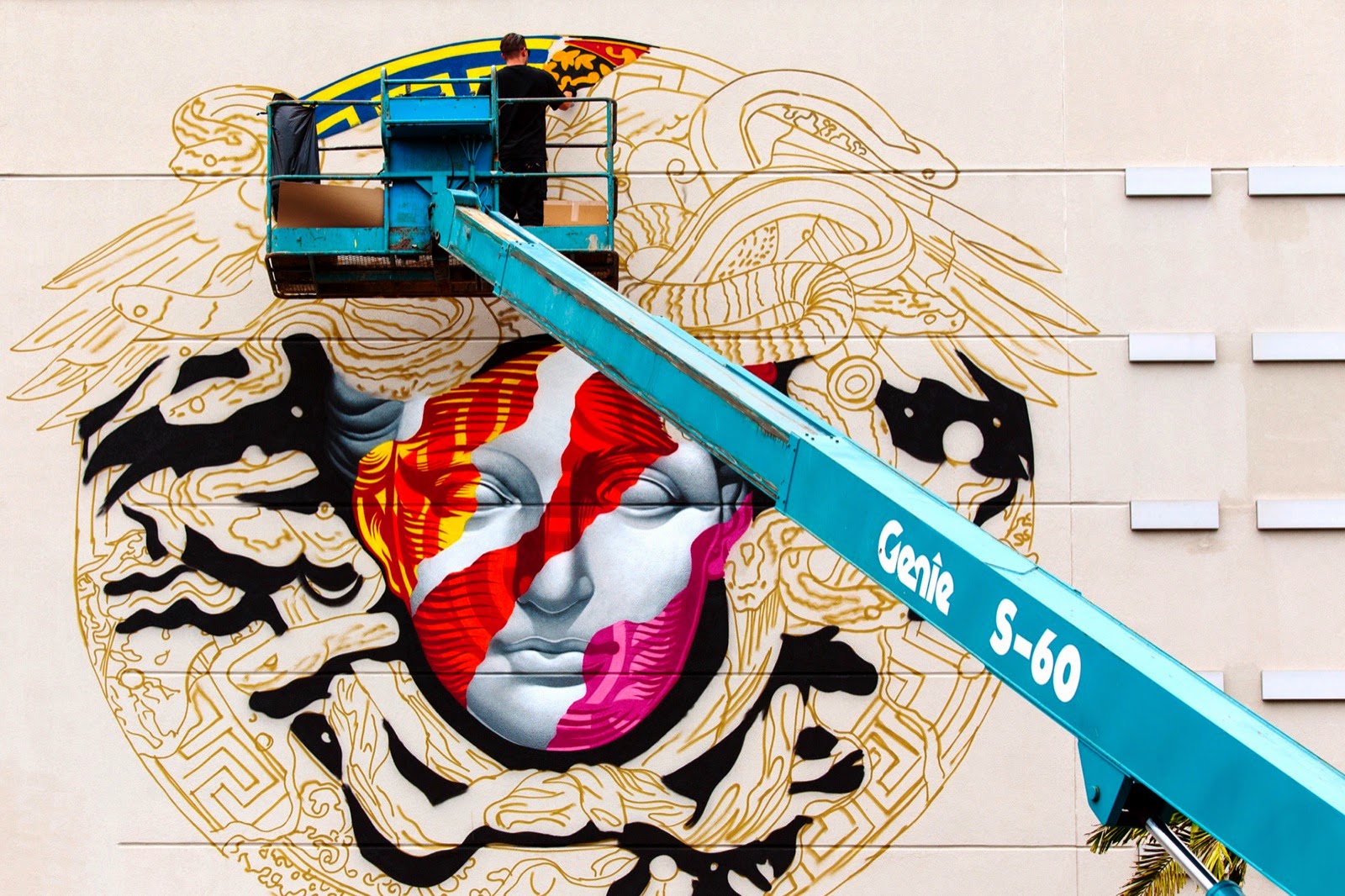 To celebrate the opening of their new flagship in Hawaii, Versace worked with POW! WOW! to provide a large scale mural on one of the key arteries in Honolulu. Located on the intersection of Ala Moana Boulevard and Keawe Street, curator Jasper Wong brought in world-renowned street artist Tristan Eaton to create his own interpretation of the iconic Medusa.
