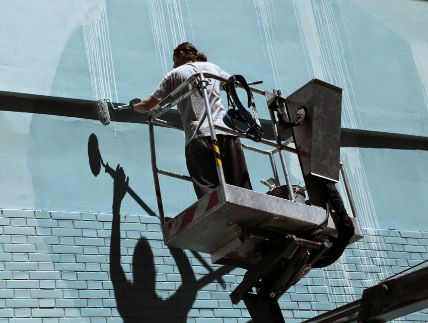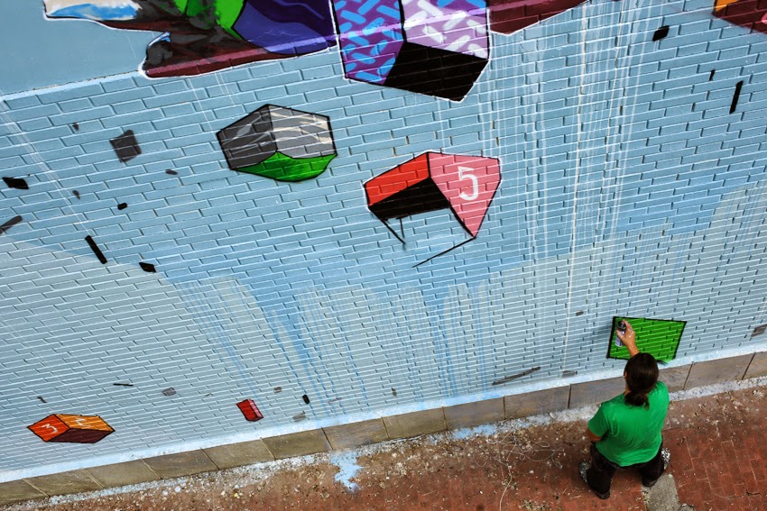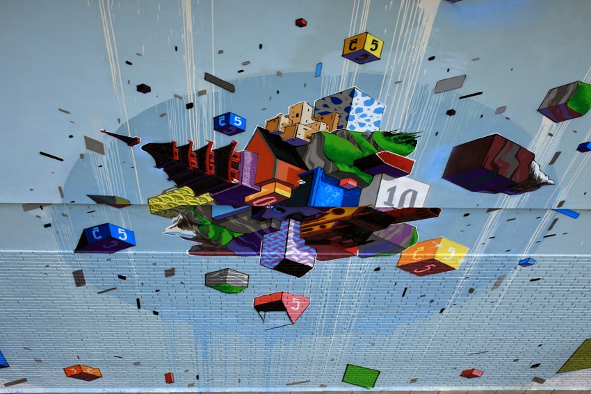 The talented Italian muralist works within geometry and lends himself to a more 3D style. Floating geometric forms create massive compositions and the scale helps define the forms as they intersect and climb upon each other.