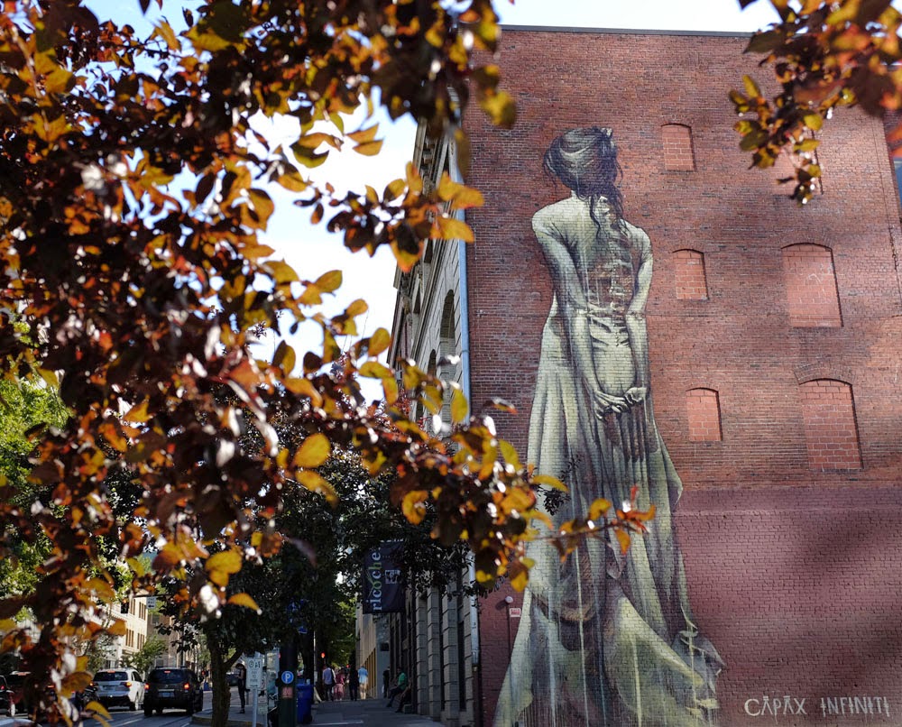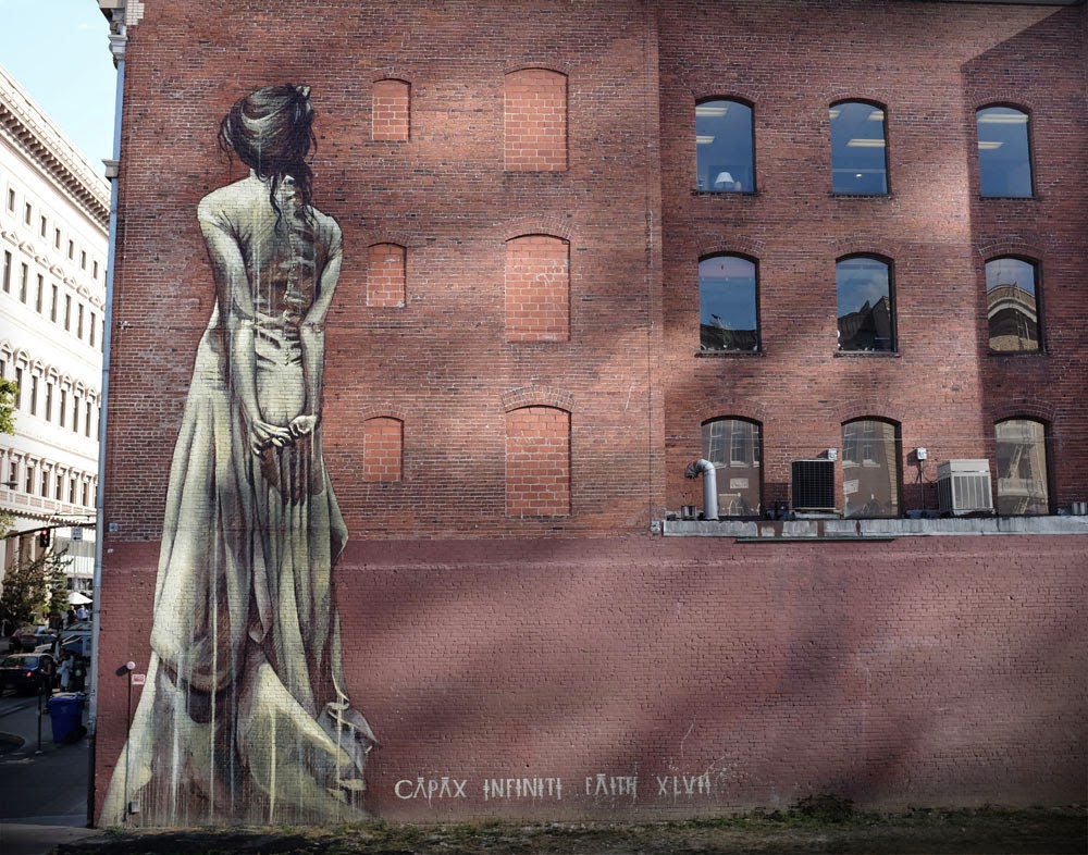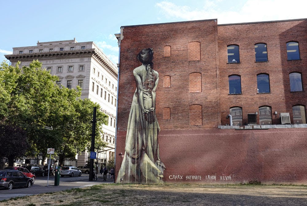 Entitled “Capax Infiniti” (“Holding the Infinite” in Latin), the South African muralist painted this beautiful piece showing a ghostly-like woman with her back turned to us.