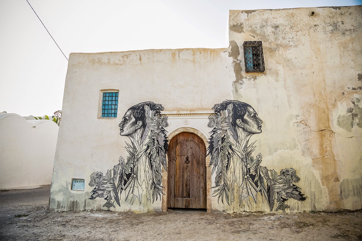 Swoon was also invited for the Djerbahood project to paint on the island of Djerba in Tunisia. The American artist brought some of her signature pasters for the locals to enjoy. Brooklyn-based artist Swoon celebrates everyday people and explores social and environmental issues with her signature paper portraits and figurative installations. She is best known for her large, intricately-cut prints wheat pasted to industrial buildings in Brooklyn and Manhattan. The Djerbahood project is organised by Paris’ Gallerie Itinerrance.