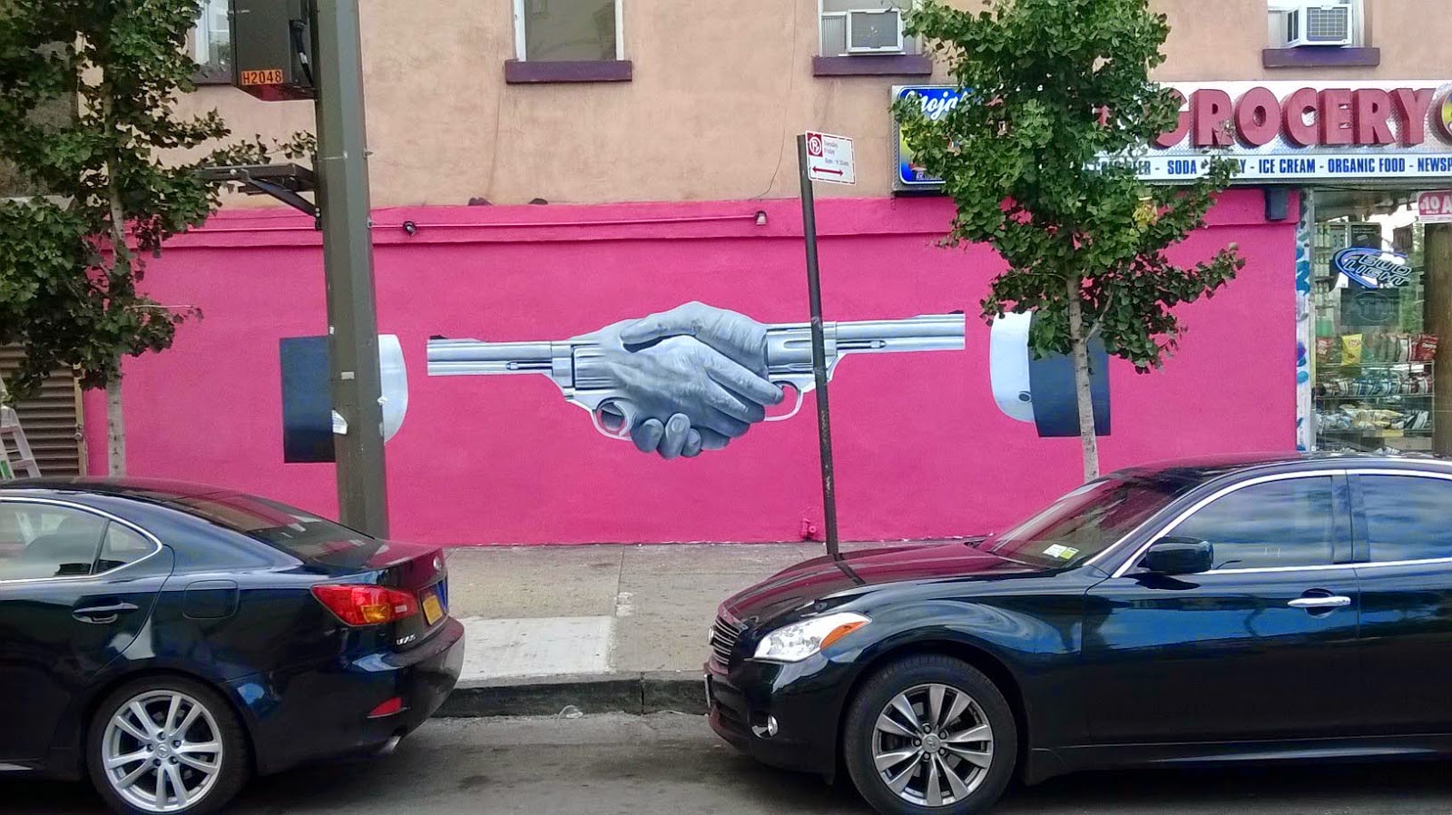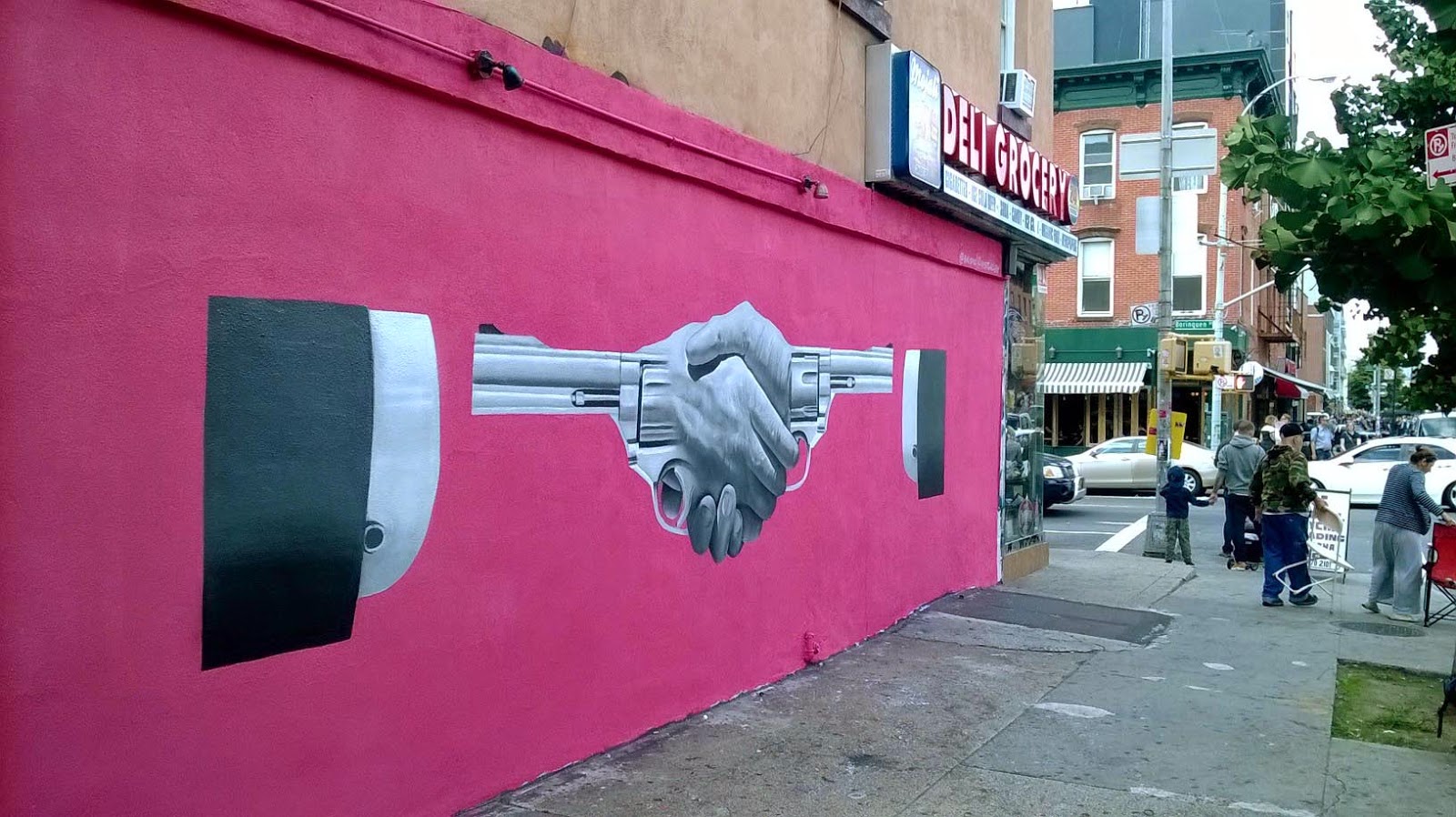 The Puerto-Rican street artist had enough free time to grace Williamsburg with a striking mural which is entitled “Handshake”. Featuring Bikismo’s photo-realistic technique, this symbolic piece shows two hands morphing into guns, a clever commentary on today’s society.