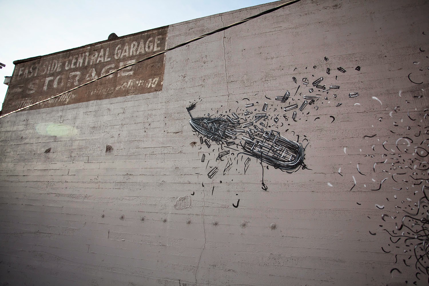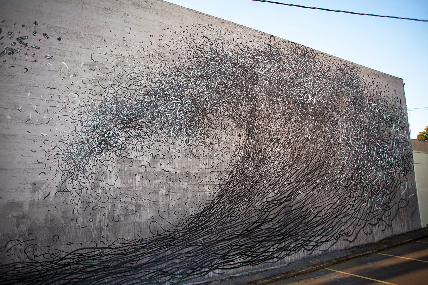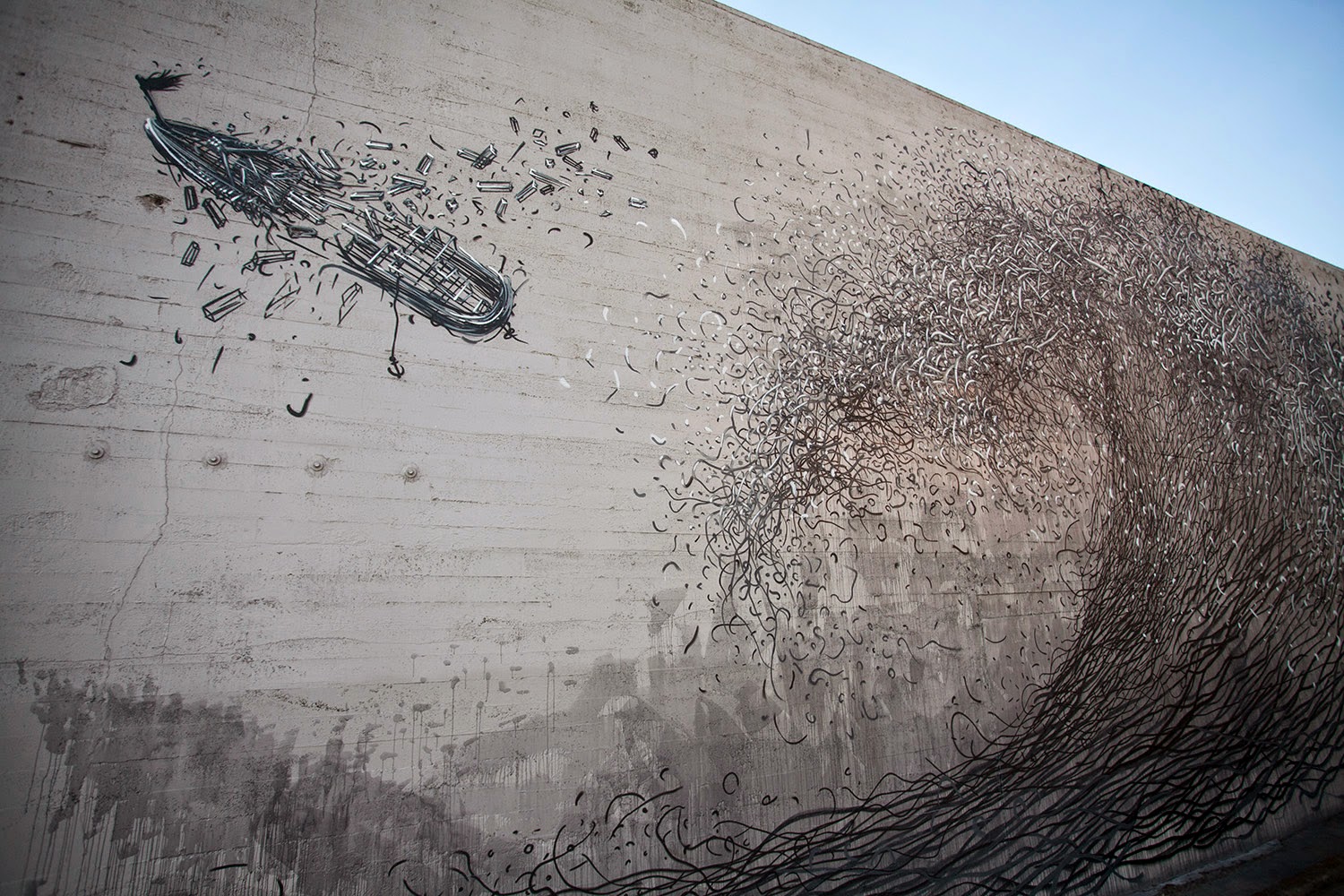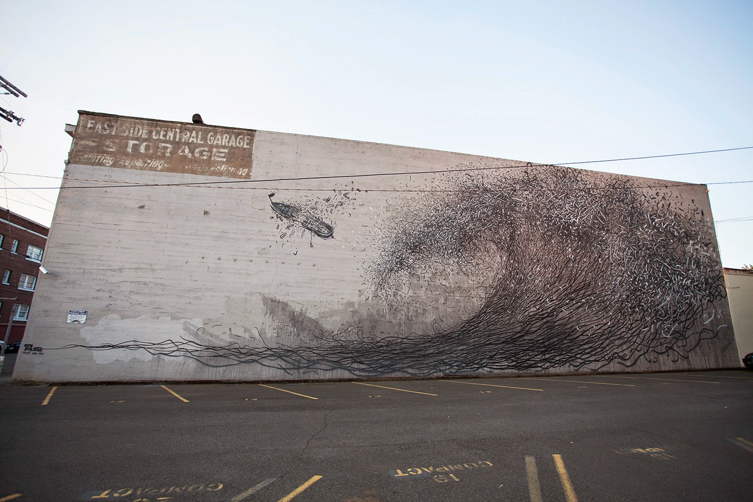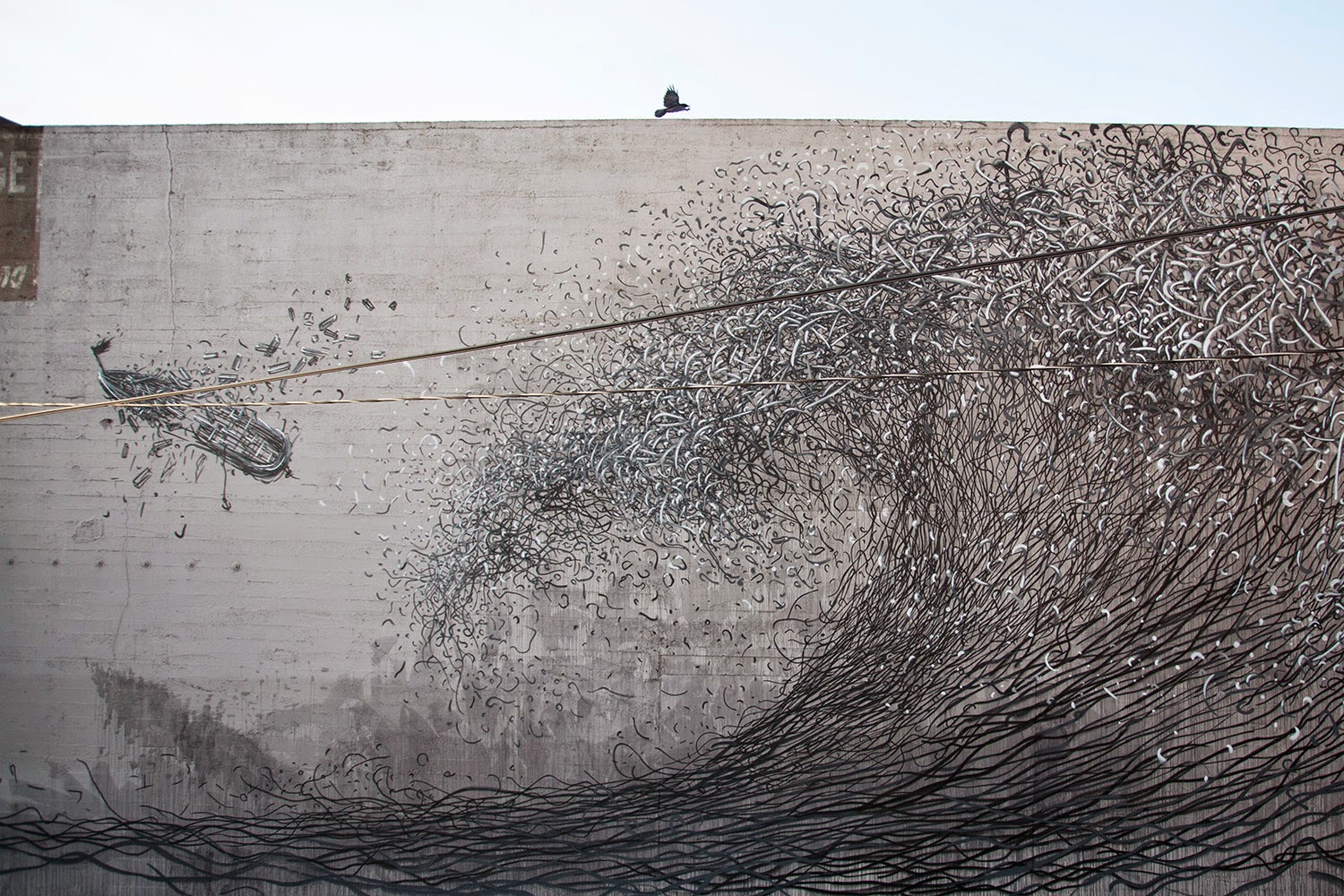 The new mural titled “Persistent Parabola”, this is the moment of the wave playing with a cargo ship and the falling crates. There is a old Chinese saying: Water can carry a boat, it can also turn it upside down.I imaging my life journey is like the cargo ship carrying all the crates on the ocean, as well as the plans, wishes, relationships and the things that I’ve attached with as the importance. By thinking of the capacity and impermanence face to the ocean, I feel I am the most insignificant one in the entire world. It brings me more appreciations towards what I have right now. I guess that’s where the idea come from behind this work. —DALeast