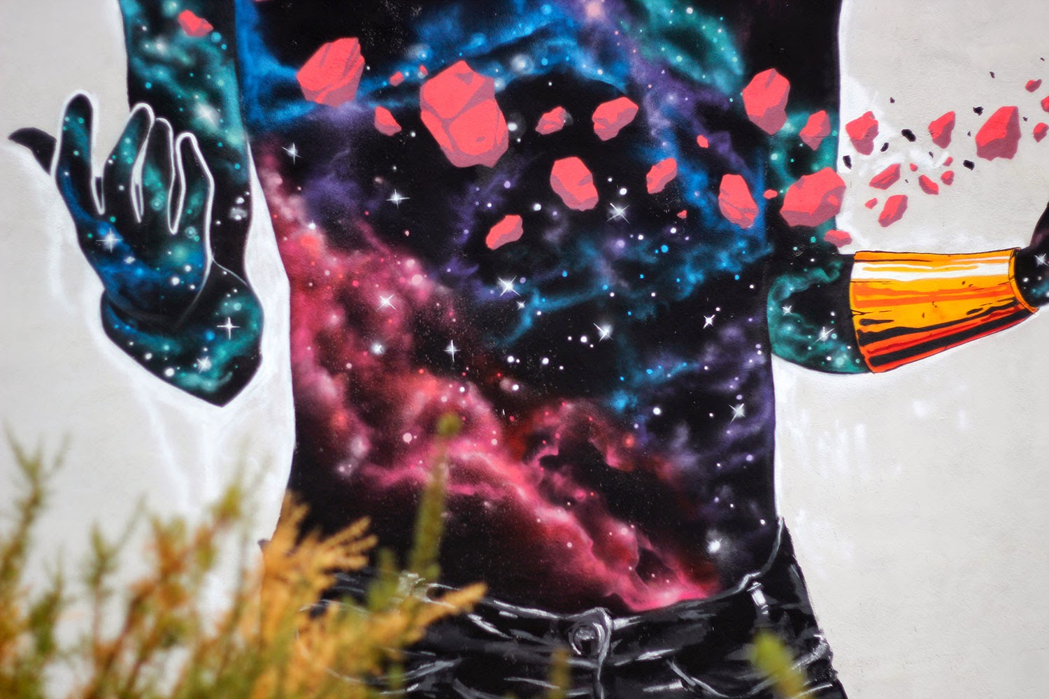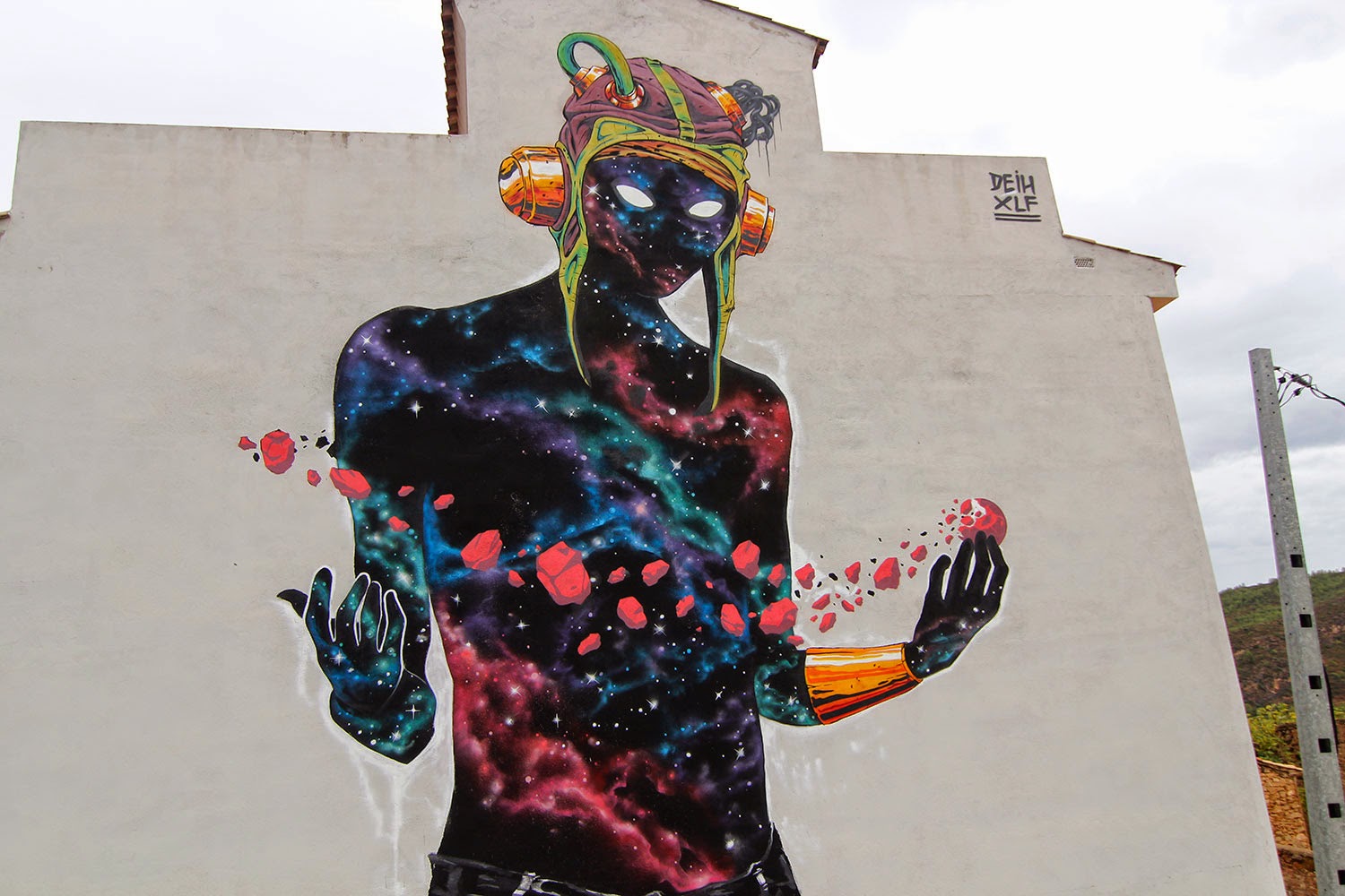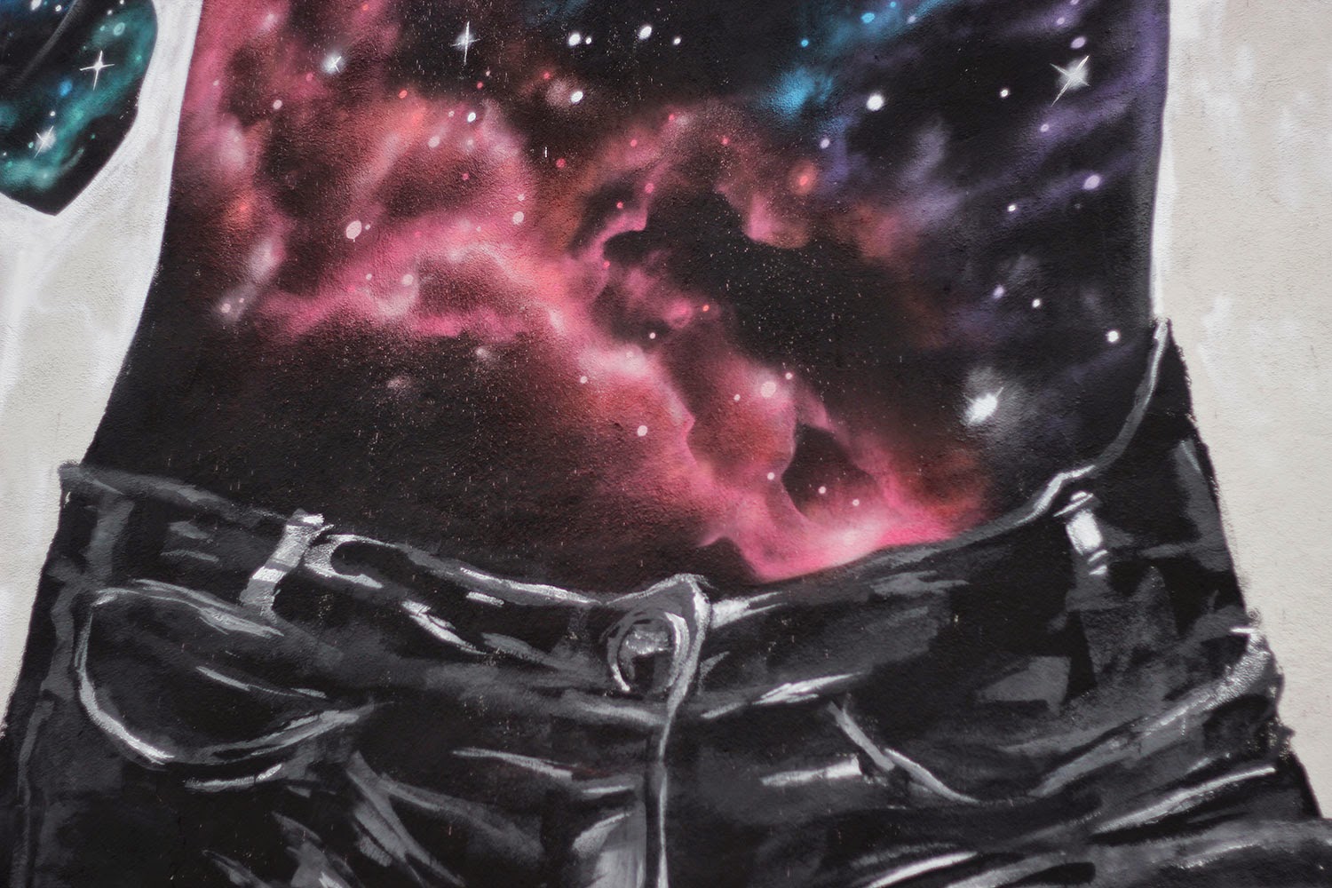 The Valencia-based muralist spent a few days working on this massive piece which is entitled “The Visitor”. This artwork features one of his trademark characters which appears to be entirely filled by a beautiful and endless galaxy.