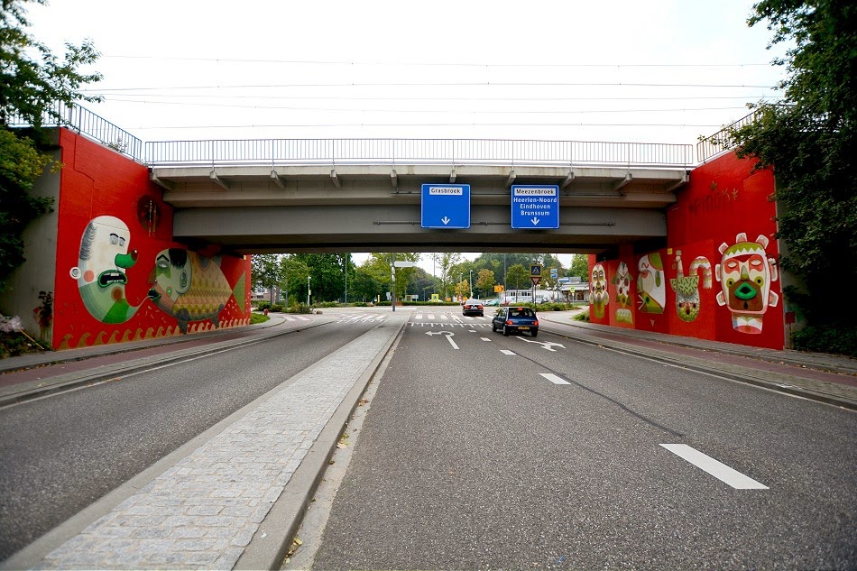 Known for his flat, naive style, use of green color, and totem like artworks that feature faces and symbols inspired by the rich Brazilian culture, Finok created a similar mural for the event. Using gold and bright colors, lively patterns, and almost tribal-like elements, his distincive double piece is brightening up this underpass somewhere on the streets of Heerlen.