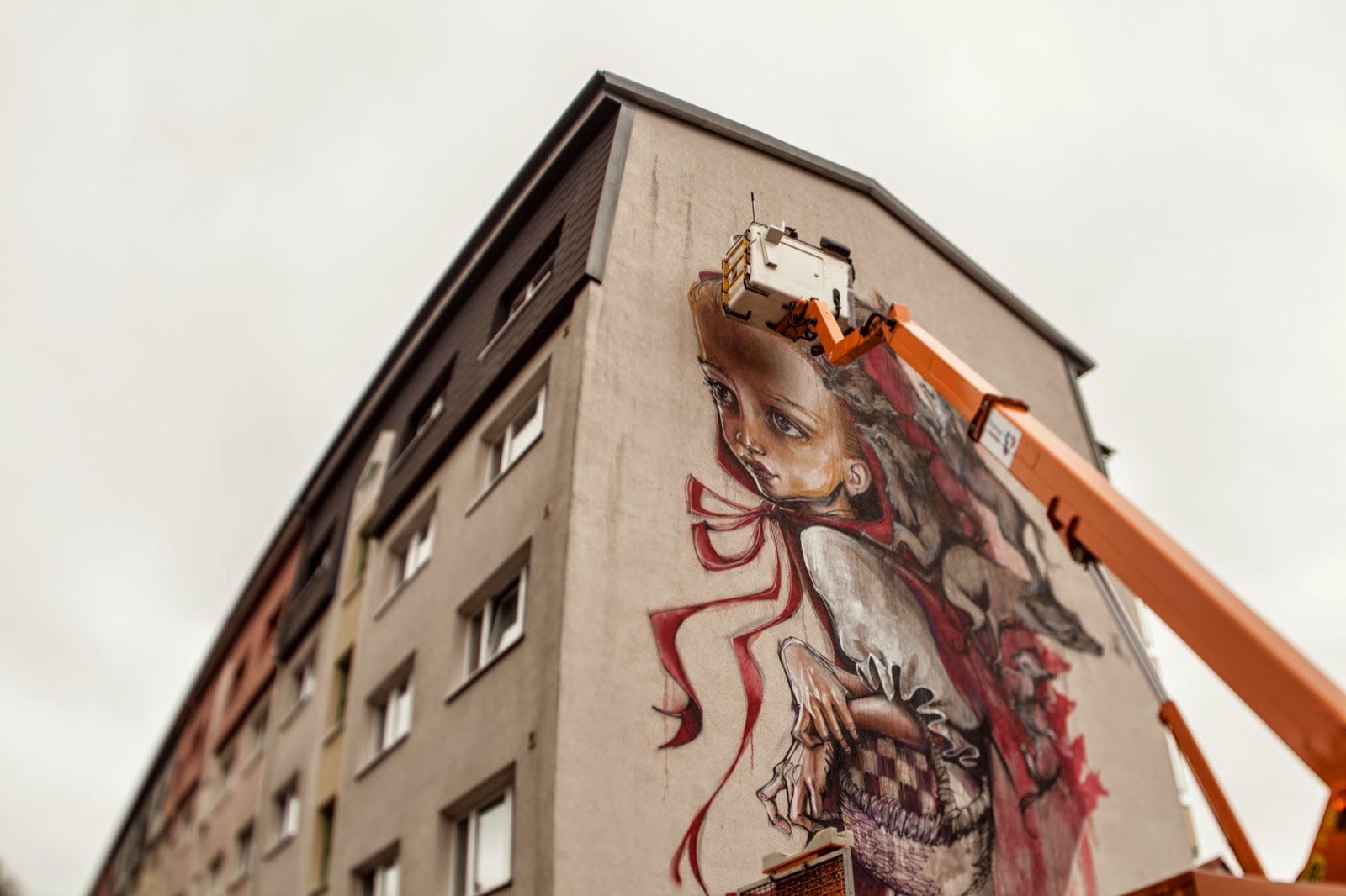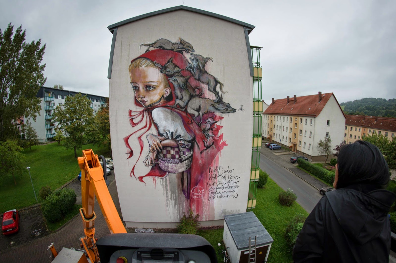 Painting on the streets of Schmalkalden, the German street art duo painted this signature piece which is entitled “Once upon a time”. Herakut’s artwork takes place once upon a time, referencing their cultural origins. Their version of Grimms’ “Little Red Riding Hood” deals with the power of clichés. The artists want to point out how easily clichés are readily accepted – and how much courage and work it takes to overcome them. The text reads “Not every wolf is bad. (We are often only too lazy or too cowardly to realize that.)”.
