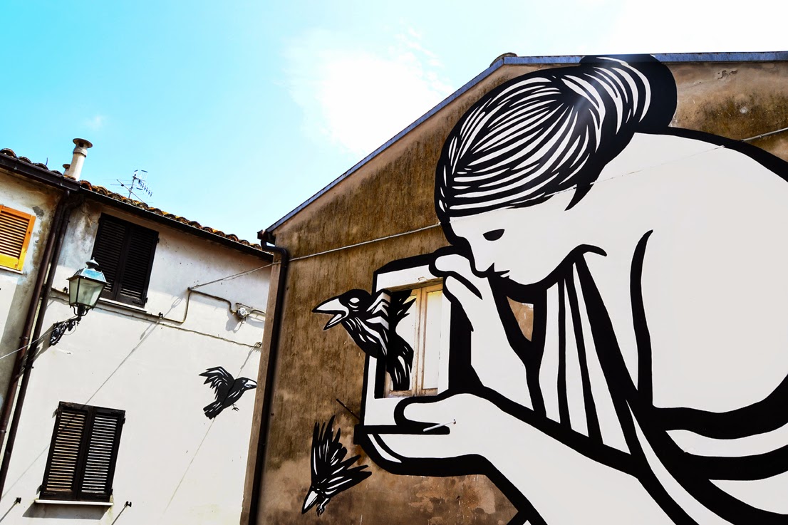 The Italian muralist painted this signature monochrome piece which is entitled “Root Of Evil”. It is inspired by the legend of Pandora’s box and was painting out during the Visioni Perifreriche Street Art festival.
