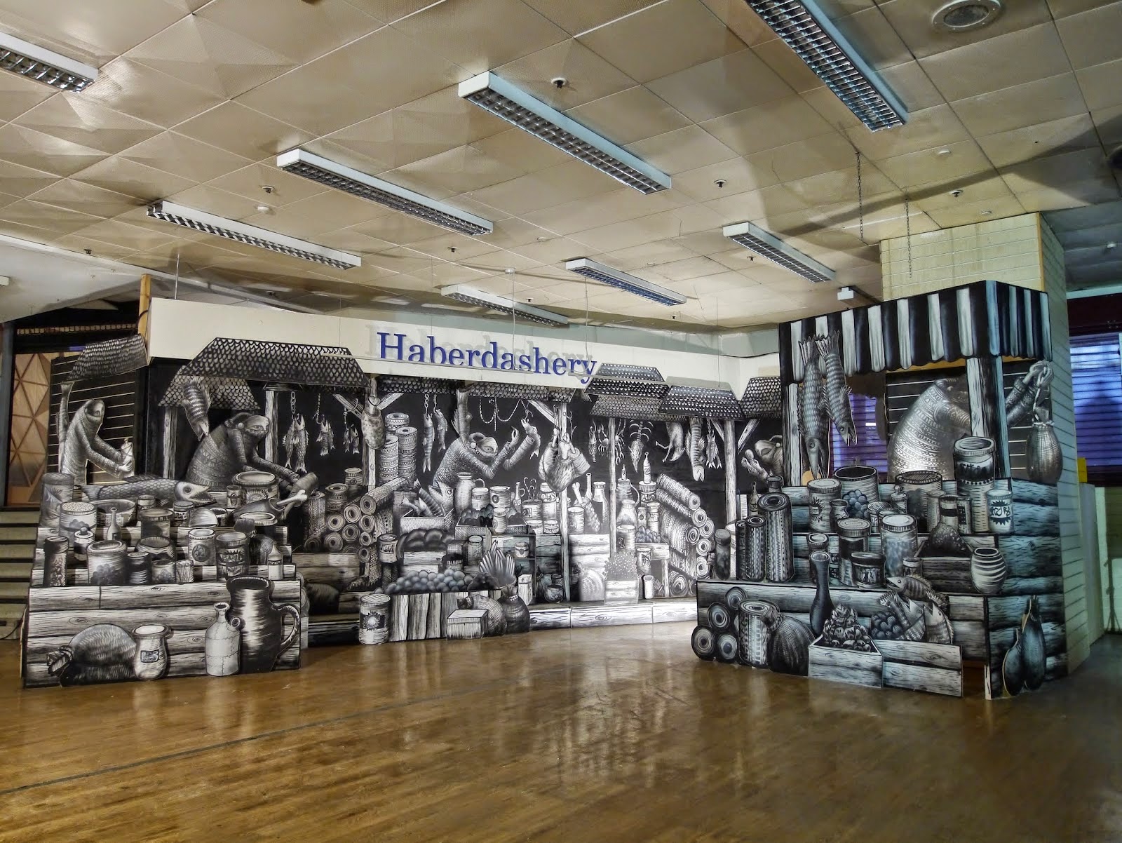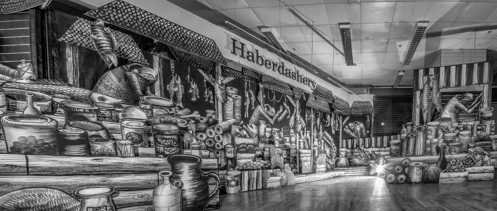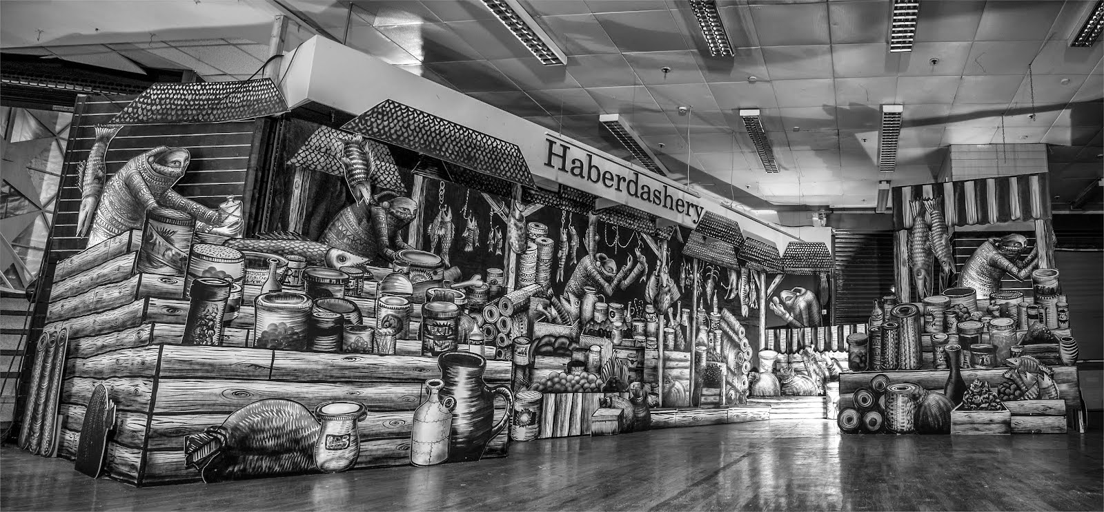 After his piece for the Royal Opera House in London, Phlegm seems to be focusing on creating new installations. The British artist just wrapped up yet another fantastic and intricate indoor piece for the Sheffield Bazaar in Sheffield, UK. Entitled “Market Traders”, this new creation by Phlegm is filled with hundreds of amazing details which needs to be seen in the flesh to be fully appreciated. The area where this piece was created is also the oldest part of sheffield as a settlement and has long been a site for market traders. It’s also the area where sheffield castle once stood long ago.