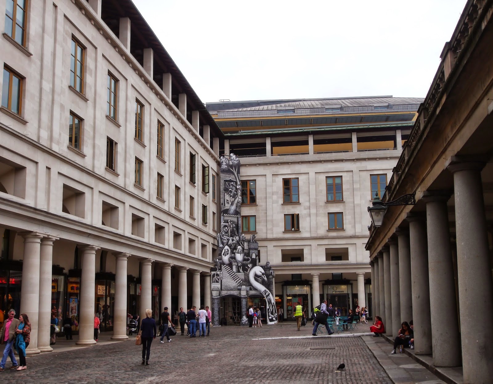 Painted for the Festival of Myth curated by Minna Moore Ede of the National Gallery and the Royal Ballet. The work he’s done there is based on a blend of his own mythology and that of prometheus and leda and the swan. The wall is a sculptural piece built onto three wooden tiers covering the piazza entrance to the opera house. Sections of this are painted in cut out sections raised from the main structure to add depth.