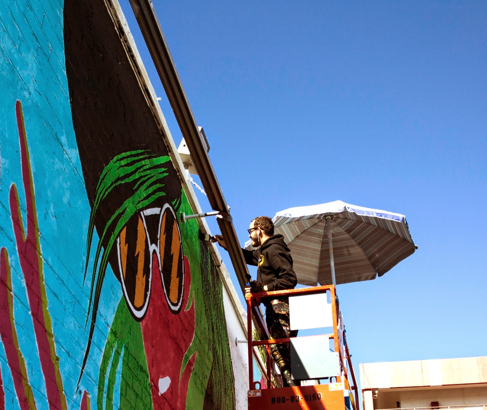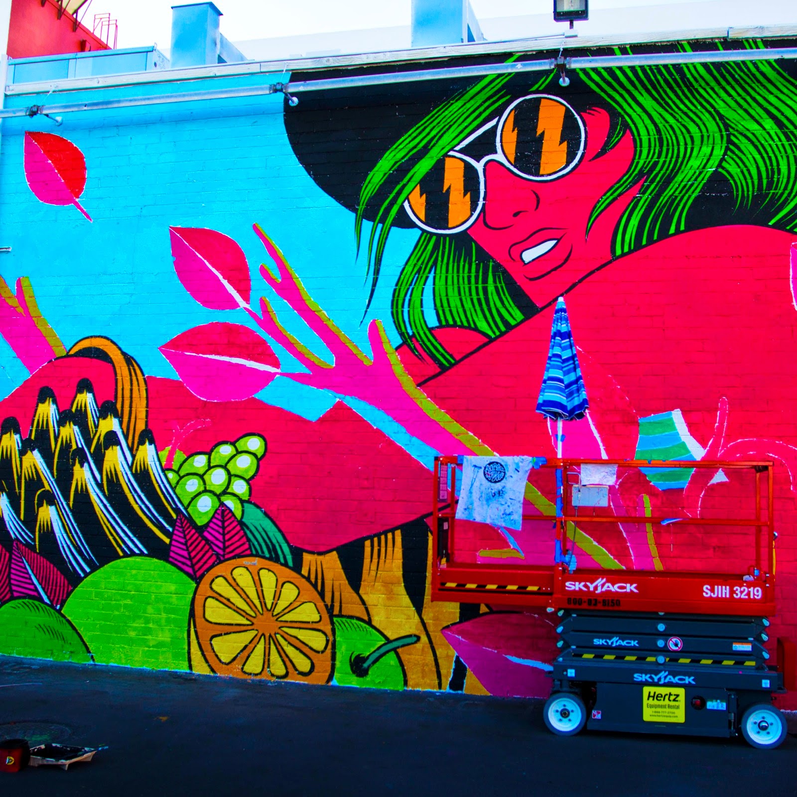 Bicicleta spent four days working on this large-scale piece which was painted using their vibrant and bold colors. This piece is depicting two of their signature rock’n’roll ladies entwined in a bunch of roots and fruits.