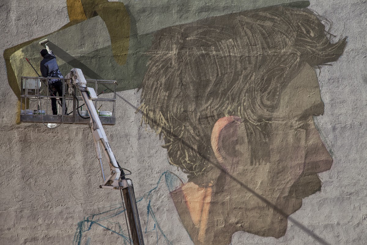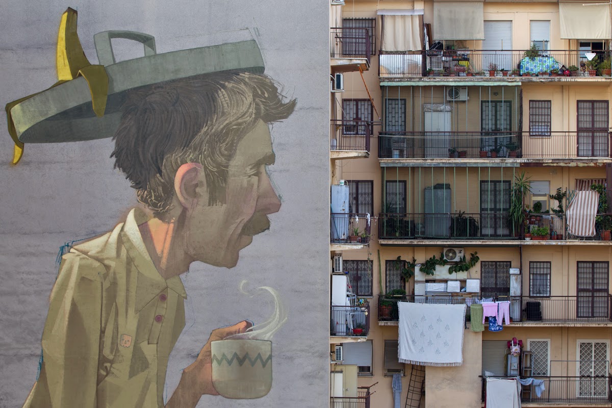 Painting with no background, using the building’s color and texture as a part of their work, the young artists created this neat image that blends with the surrounding. Showing a dark haired old man with thick mustache, having a cup of coffee while rising from a rubbish bin, the piece has a lot of elements of the place and the country it is painted in. The mural might be seen as a comment of an Italian or European economy situation.