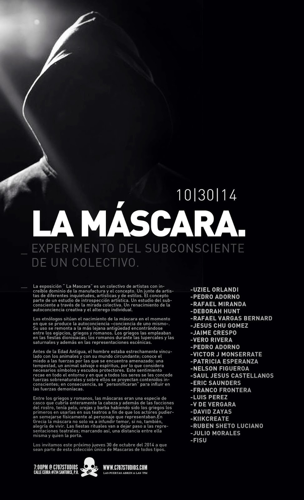 Later tonight in San Juan, Puerto Rico, our friends at C787Studios will be opening a new group exhibition entitled “La Máscara”.