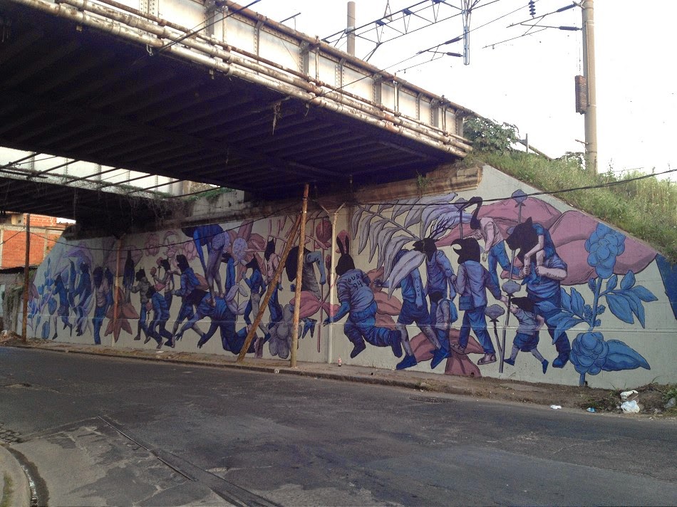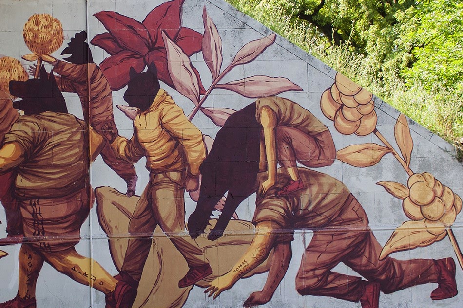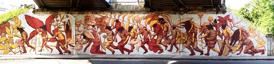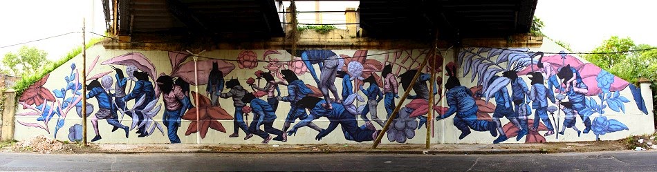 With Jaz’ signature anthropomorphic characters, juxtapozed with Pastel’s floral imagery, the piece has a strong contrast effect. Both color wise between two pieces, but also with easy, calming feel of the flowers and plants, against aggressive looking characters depicting football hooligans.