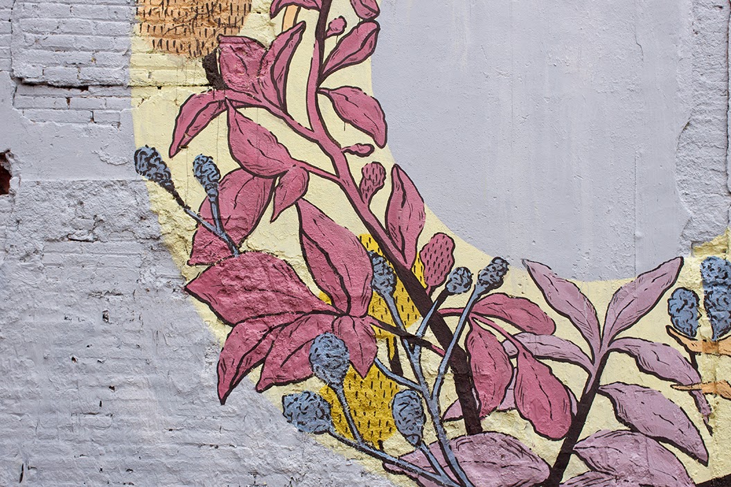 The Argentinean street artist quickly worked his way through this signature artwork which shows a beautiful series of plants arranged within a yellow circle.