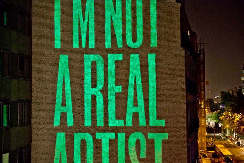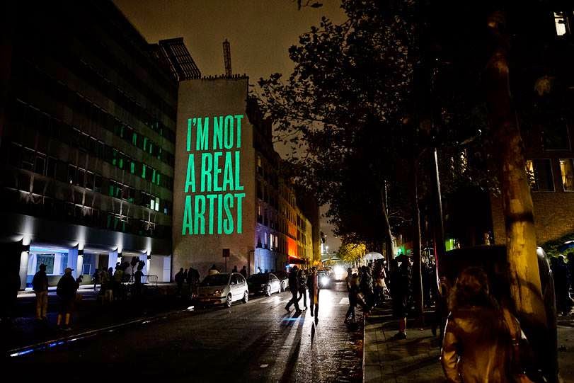 The letters were painted with phosphorescent paint that is replenished throughout the day by the light of the sun as well as by spotlights placed in front of the building. After the lights are fully charged, they shine brightly on their own once night falls. — SpY