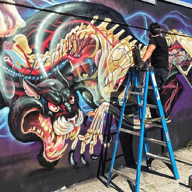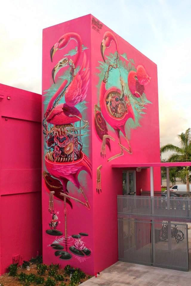 As usual with the Austrian street artist, he quickly painted two technically impeccable artworks which are showing the insides of a Panther and a Flamingo..
