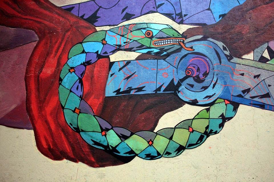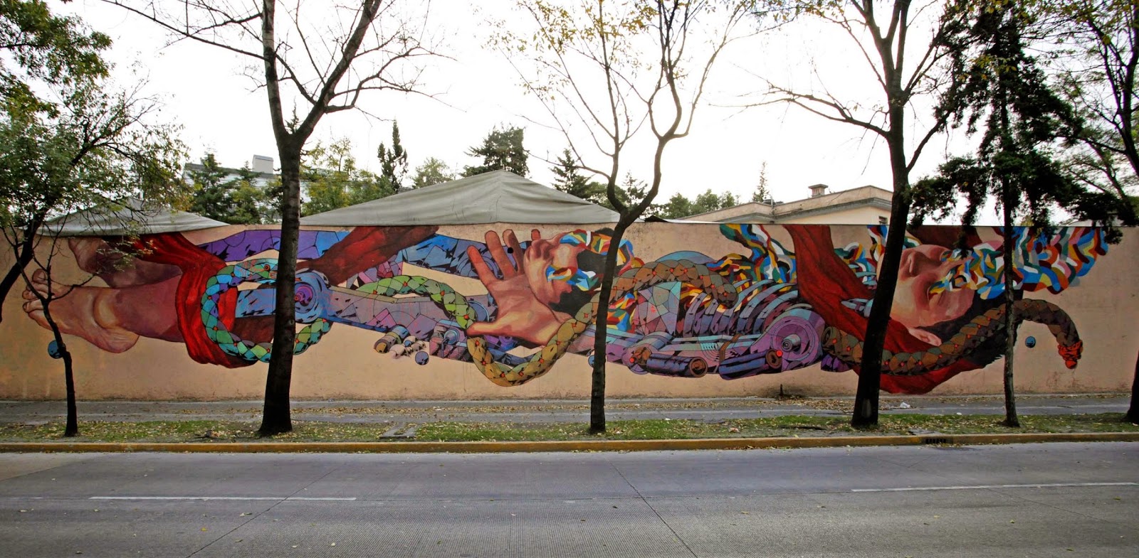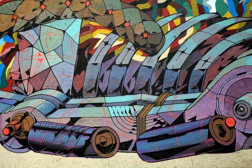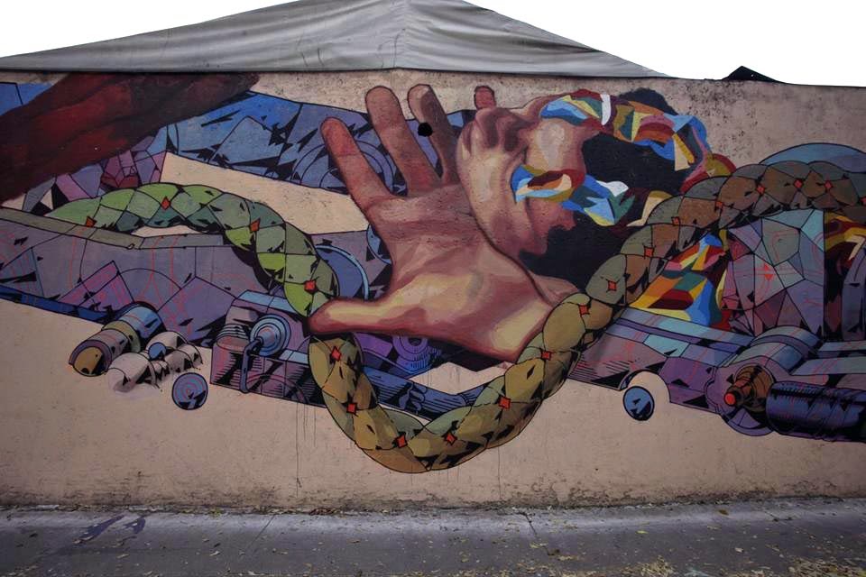 In town with Mamutt Creatividad, the newly formed duo worked on this sweet piece which is featuring each artist’s distinctive style and imagery. Entitled “Libertad”, the artwork shows the image of an hybrid man-robot entwined around a snake.