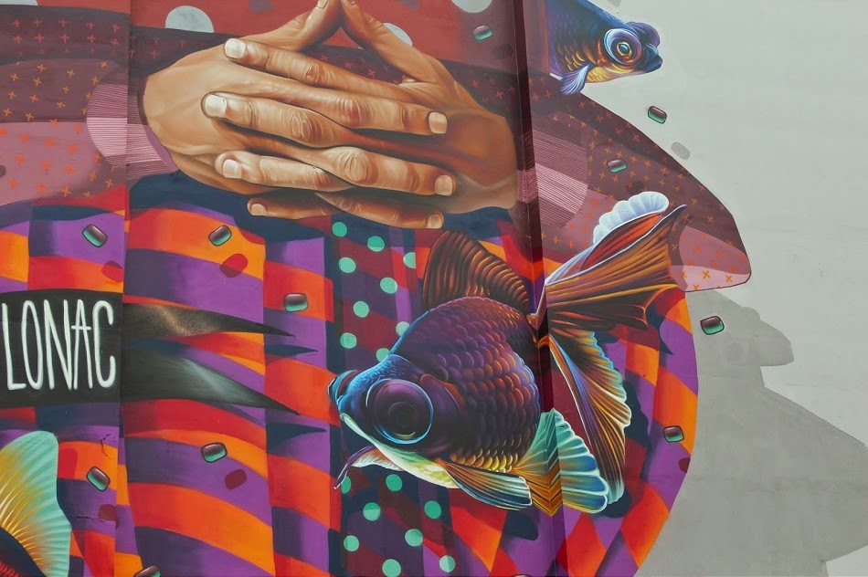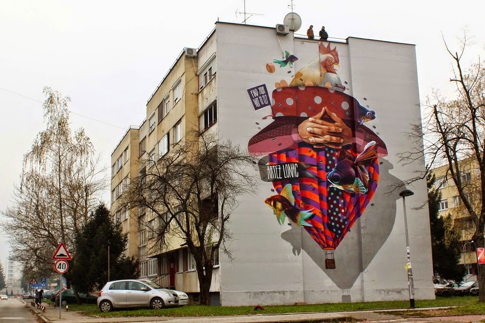 Invited by the local Flaster Jam organization, this large mural was their first collaboration, and from the photos we just received, a very successful one! Mixing Artez’s bright colors and cheerful patterns with Lonac’s masterful photo realistic elements, this surrealist piece surely brightens up the side of a residential building somewhere in Banja Luka. Working on this piece for almost an entire week, both artist showed great skills and imagination by composing and completing this complex dreamy image.