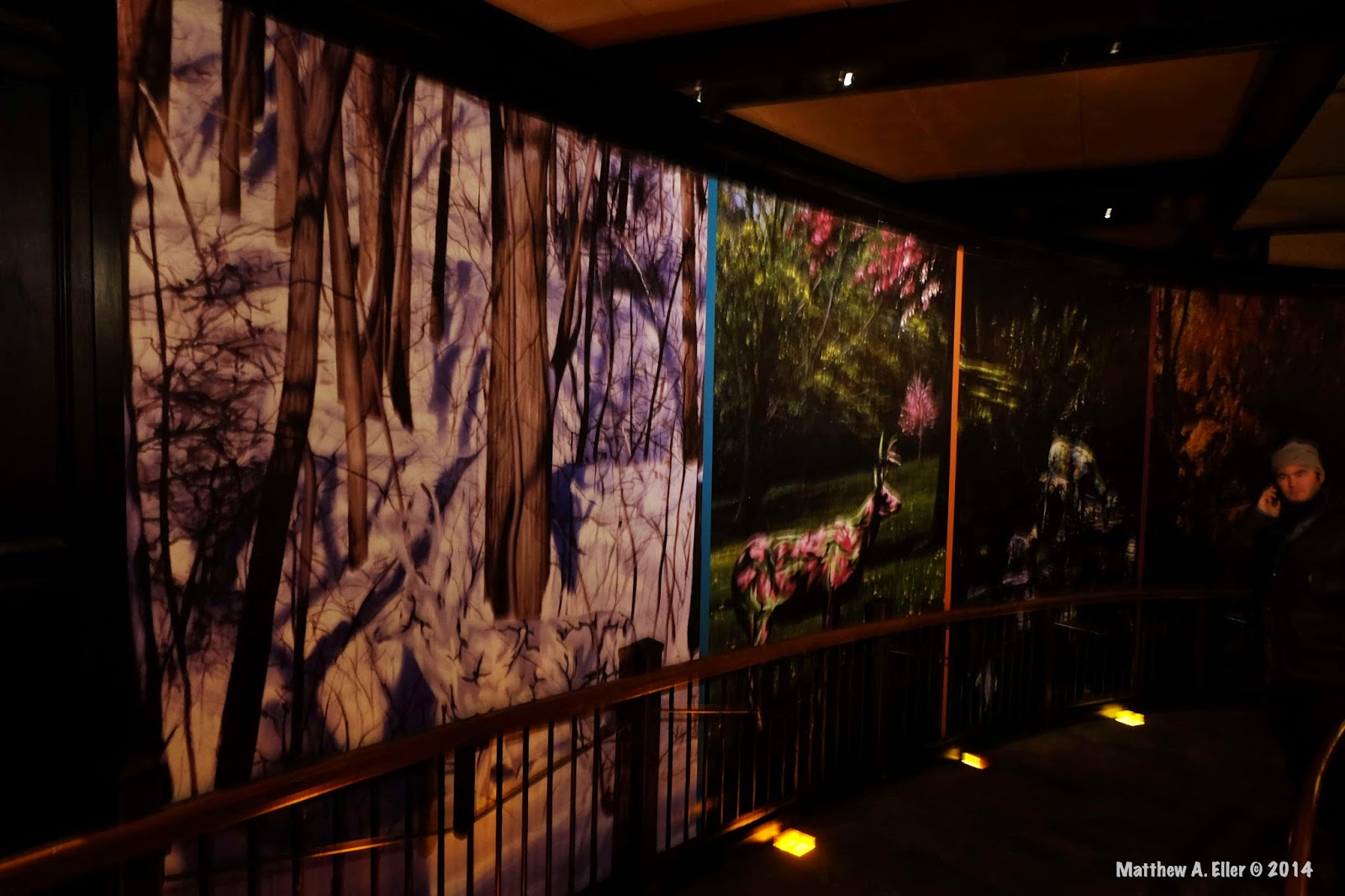 As usual Ron’s work was a mix of beauty, humor, wit, and social commentary. The large dimly lit corridors of the Tribeca Grand Hotel was the perfect place to showcase the bright if not neon camouflage animals featured in paintings and as giant almost life like statues (but made taking photos a huge pain!).