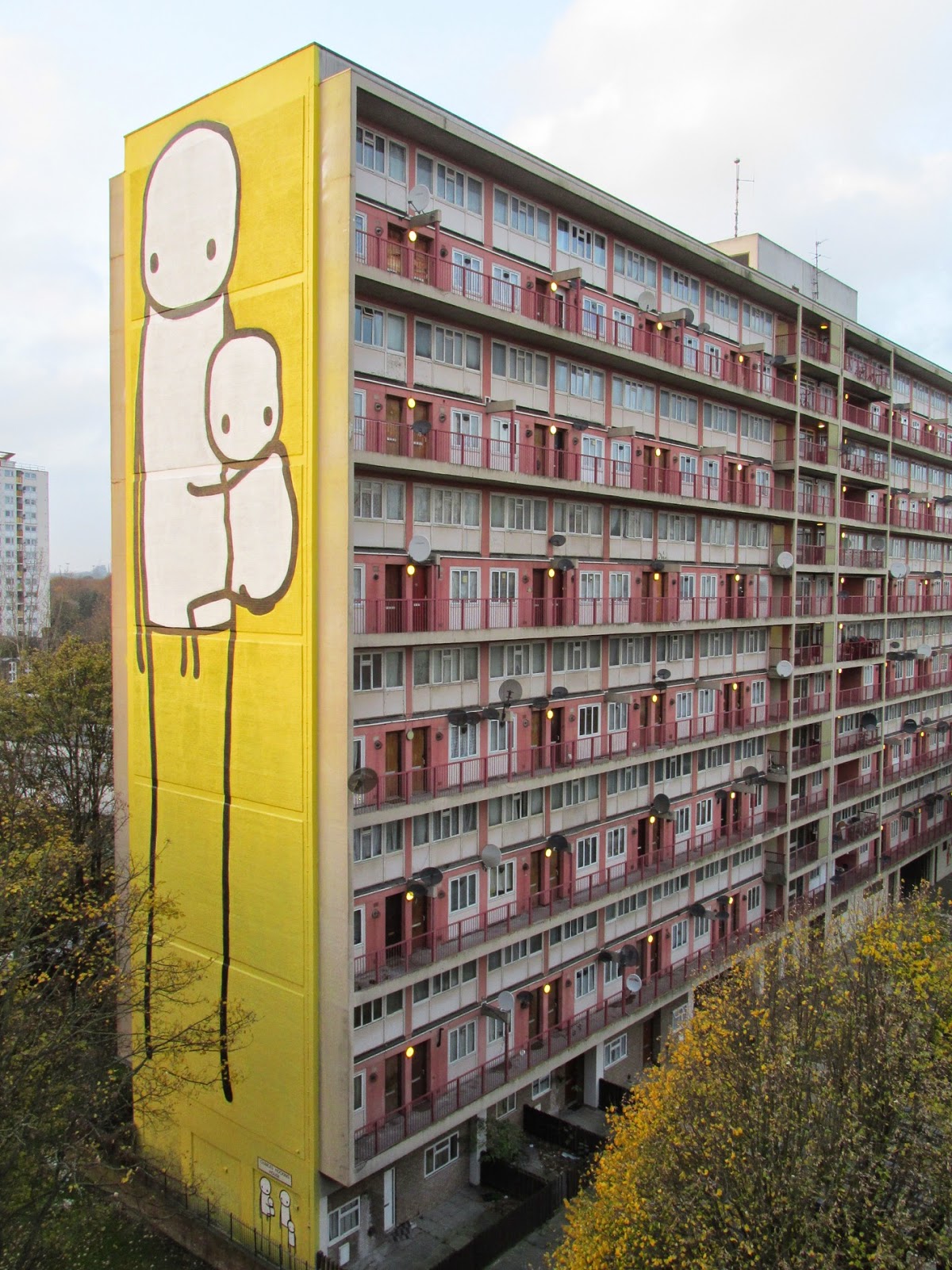 A newly completed 125 ft high mural painted by Stik on a condemned council owned tower block in Acton, West London is the tallest street artwork in the UK.