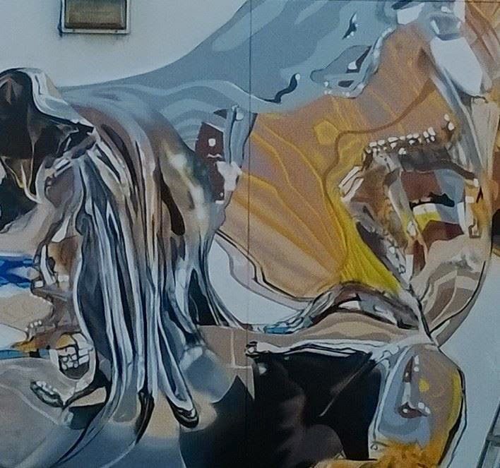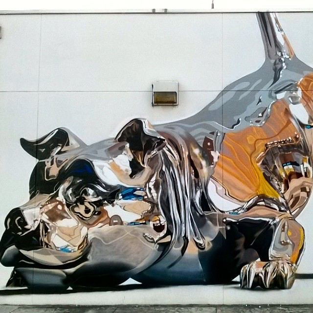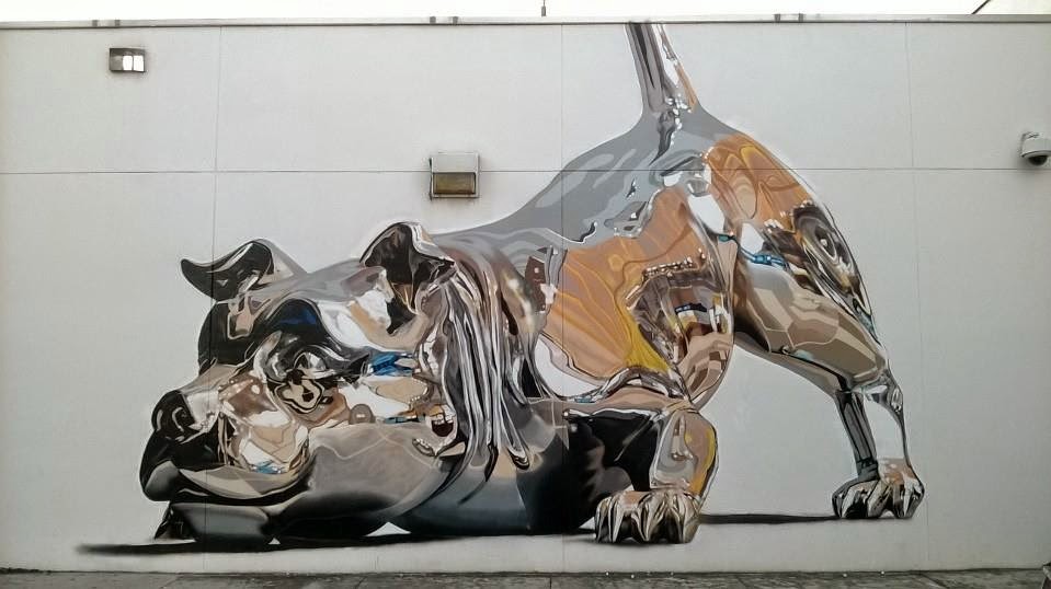 Painting for the Raw Project at the Jose De Diego Middle School, Bik spent about 4 days working on this metallic pooch made entirely using spray-paint. As usual the Puerto Rican muralist shows his impeccable technique with this stunning piece.