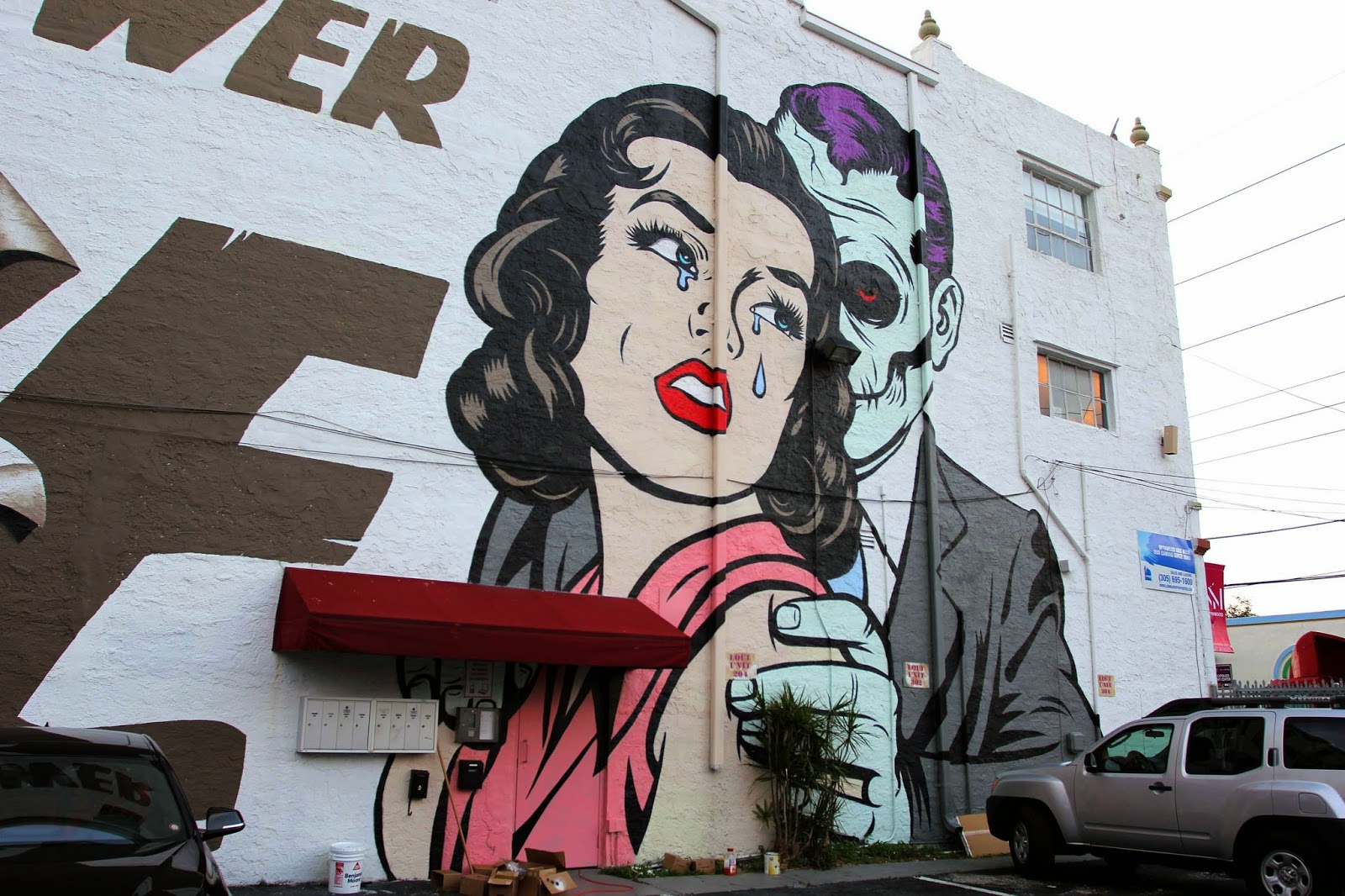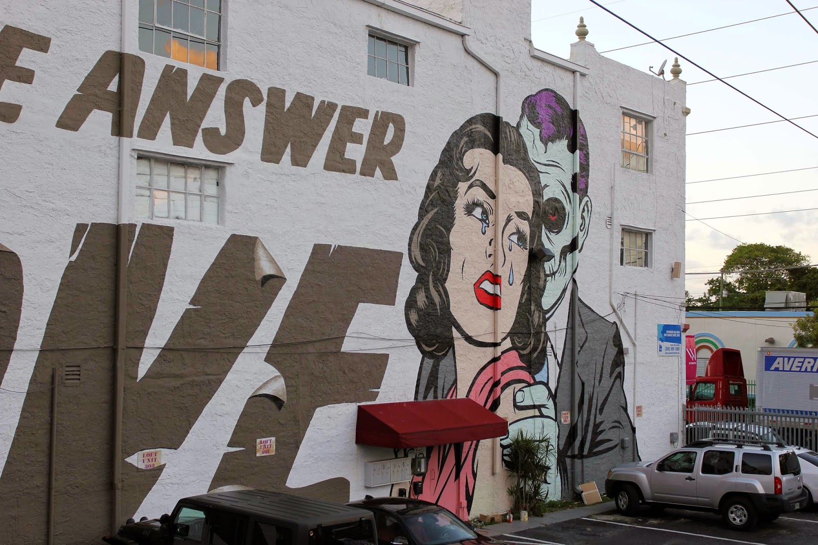 Painting in the district of Wynwood, the British street artist spent a few days working on this massive piece showing two of his signature characters. Continuing his narrative story about relationships, the piece is entitled “Is The Answer LOVE”.