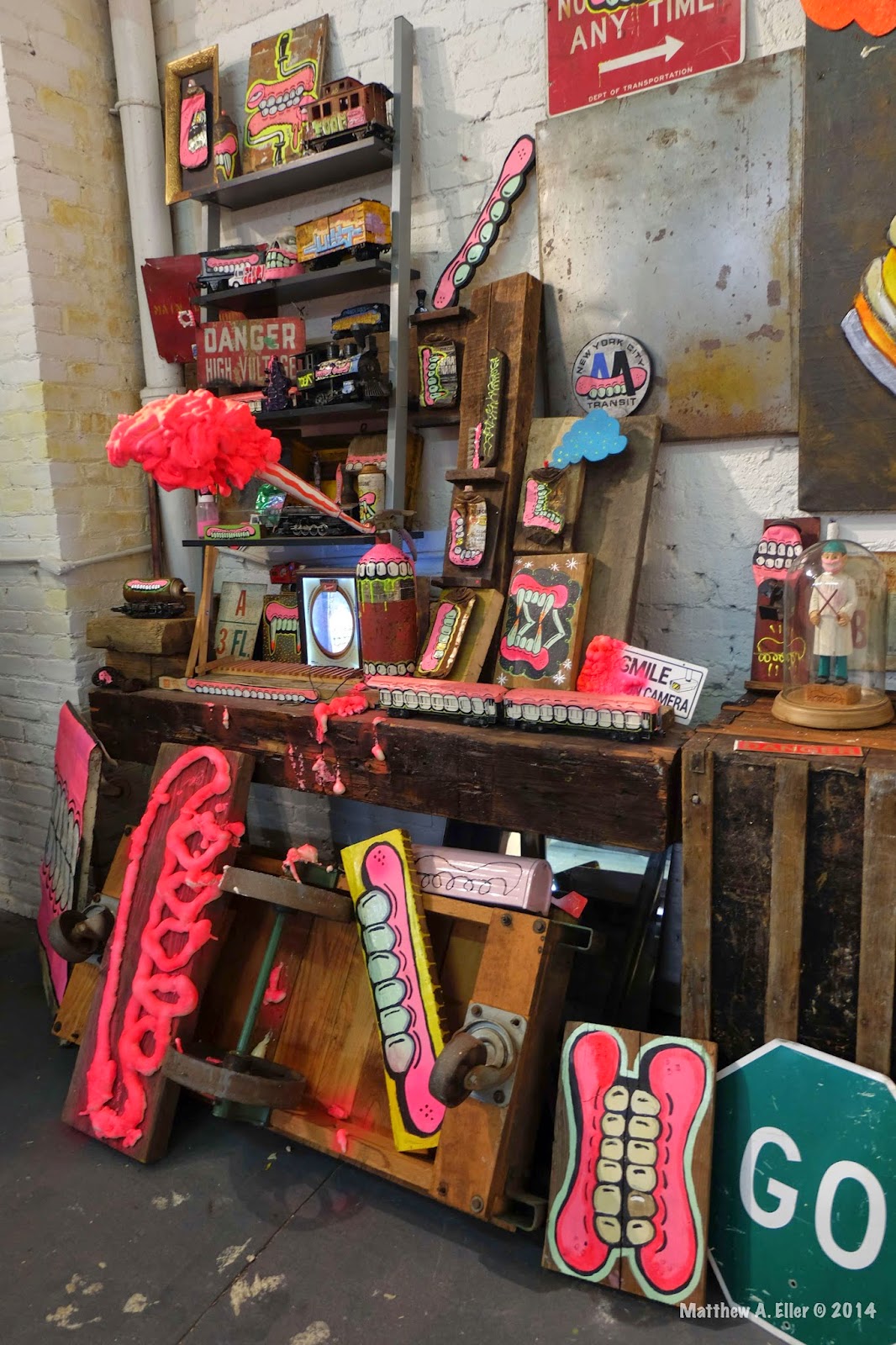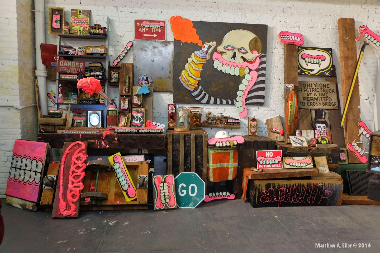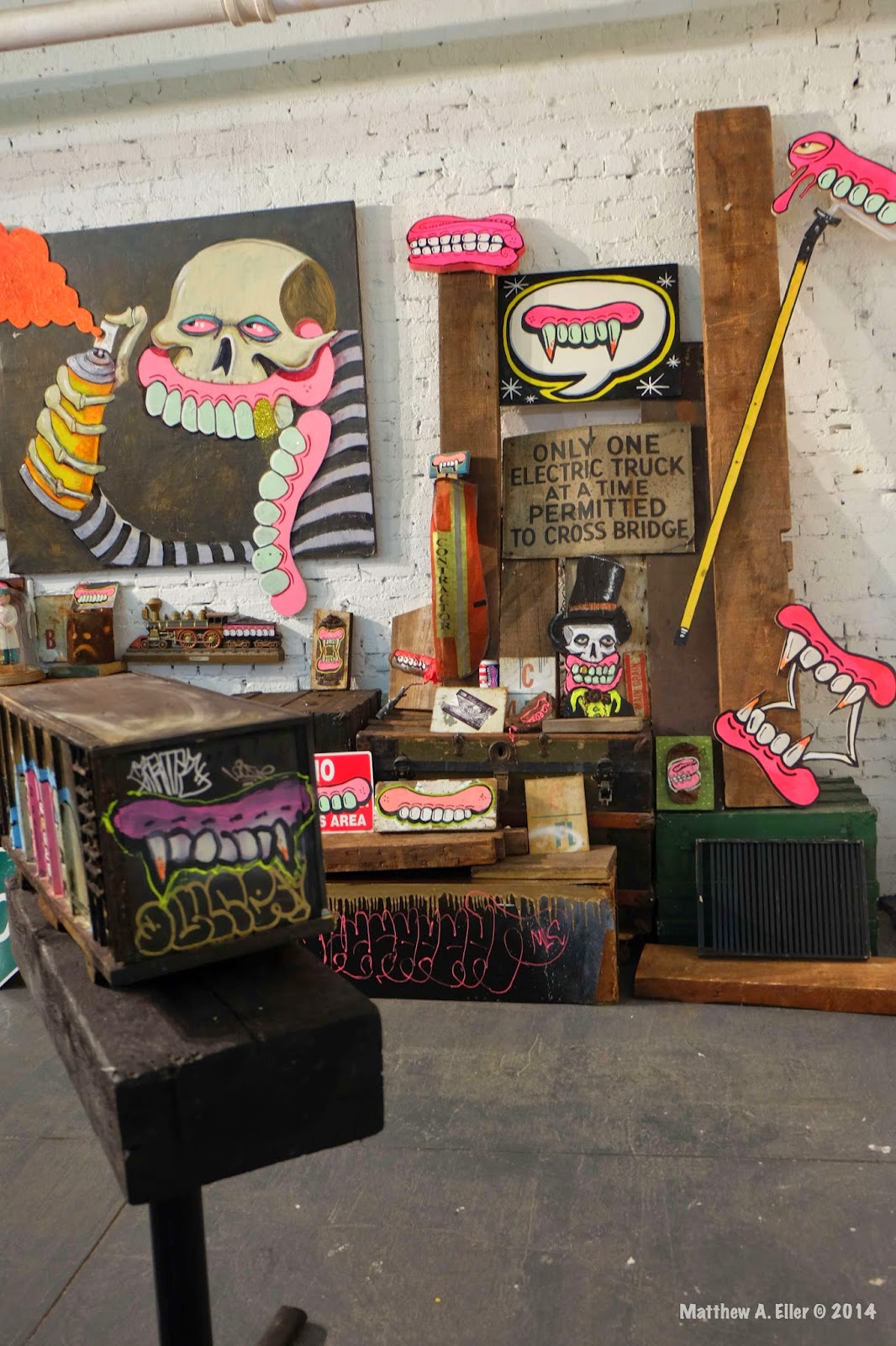 Transforming the gallery walls to depict certain freights cars as an homage to the steel canvas that so many great artists working today rely on. Handcrafted freight replicas made from vintage warehouse carts as well as salvaged train sets were on display, adorned end to end with SWEET TOOF’S magnetizing magenta chompers.