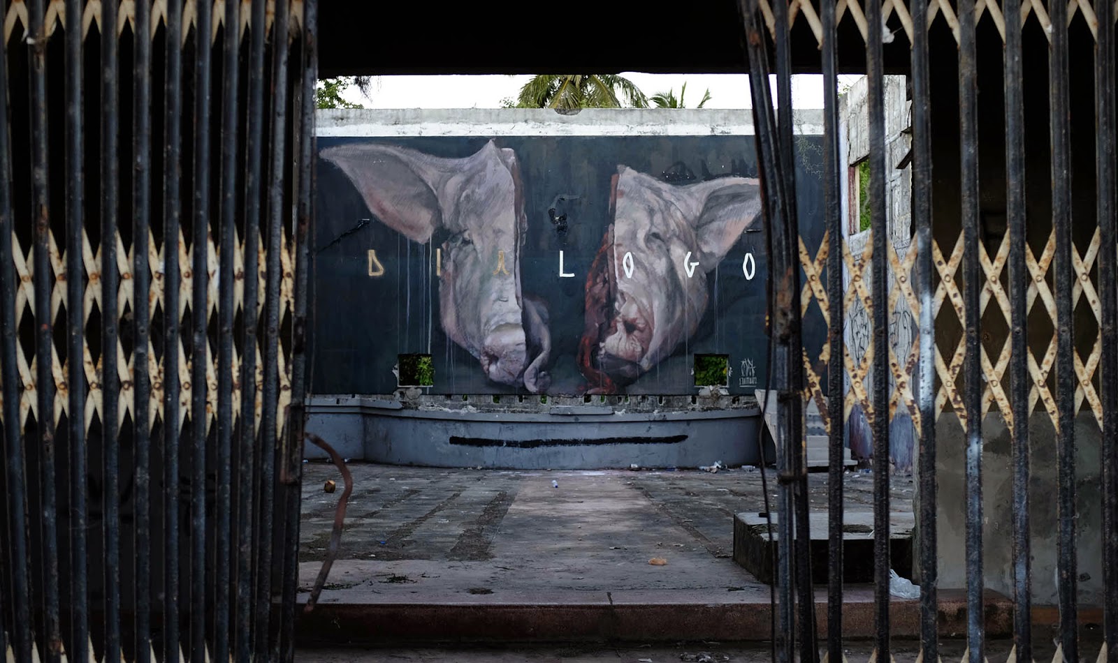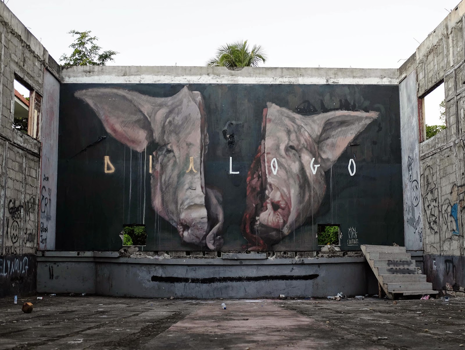 In town for the ArteSano Street Art Festival, the newly formed South African – Spanish duo spent a few days working on this rather unusual artwork showing a pig’s head sliced in two.