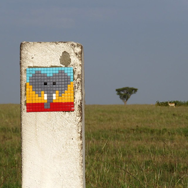 Struggling to find spots in the bush, the French street artist finally managed to find some locations to host his newly created African-themed invasions. Invader also collaborated with Vhils on a quick “Street Piece”. While this remote location is pretty unusual for street artists to visit, we are eager to know if this trop is just simple tourism or perhaps a new humanitarian project.