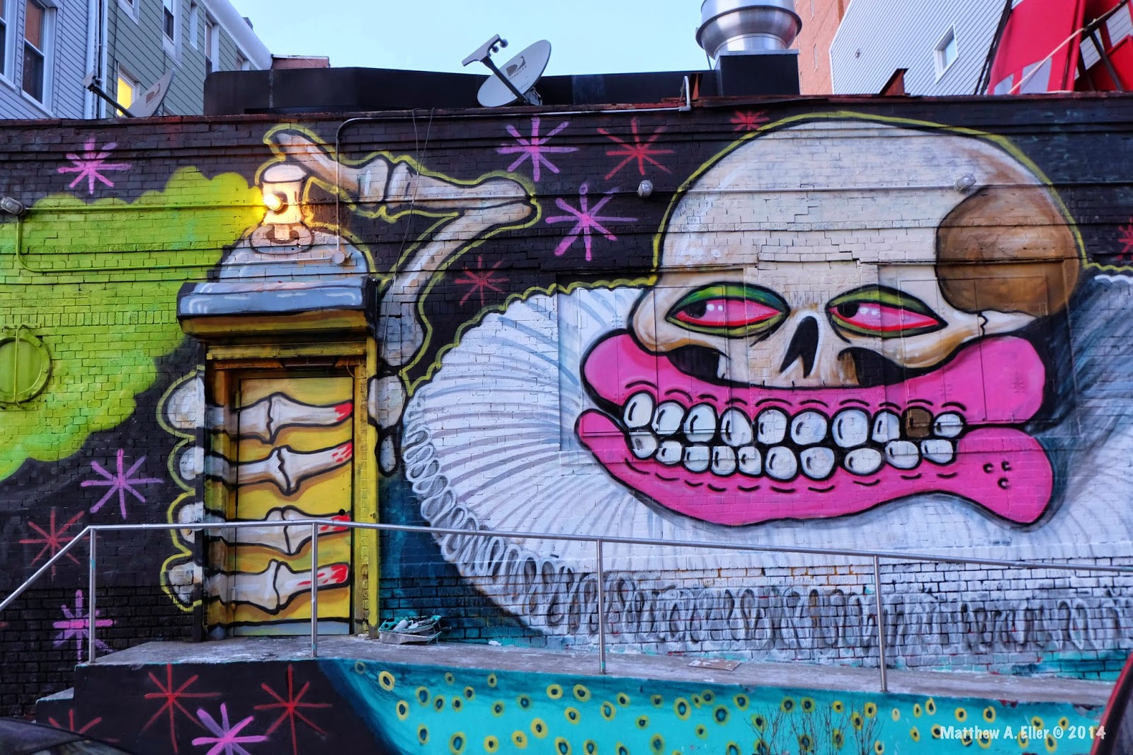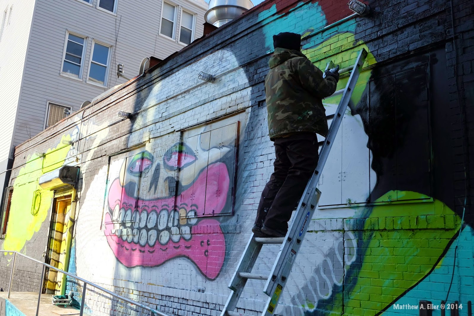 World renowned street artist SWEET TOOF who is best known for his sinister pink smiles coupled with gold teeth and renaissance accessories braved the absolute frigid NYC cold to finish his newest mural earlier this week.