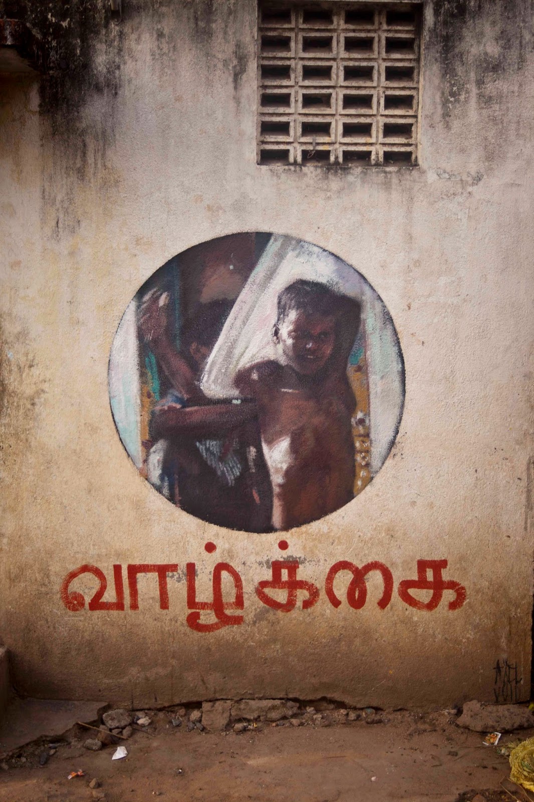 This piece is part of the “Mediocre” series. Its situated on the side of the river in the slum that is directly in front of my wall in Greenways Station, which is the first thing they see when the come out to the street. Its popularly called “G.S. Nagar”. After bonding with some kids from this area I decided to go paint two small pieces after in the end of my stay in Chennai.There I was treated with the up most sense of an honest hospitality and friendship.Despite the rough view form the side facing the river in the inside this is a beautiful and vivid place with many small houses painted in colors, the smell of home made food cooked on the street, girls drawing Rangoli symbols on the floor entrance of their houses and everything hand made with a mix of the closest care to details and scorned oddments.But with what I found to be the true life of the neighborhood where the kids, the way people interacted with them and they ran about as if the street where just an extension of their house and the people an extension of their family. The wall is based on a photo of “Dharshan”. It is painted on his house. This piece is about the kids and the effect that they have on the people around them.Special thanks to George Zolschoe for curating and the Goethe Institut for organizing. To shyam Chandar, Venkat Subramanian and Nijathan Mohan for their help and the people of Elango Street for their friendship and hospitality.