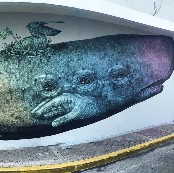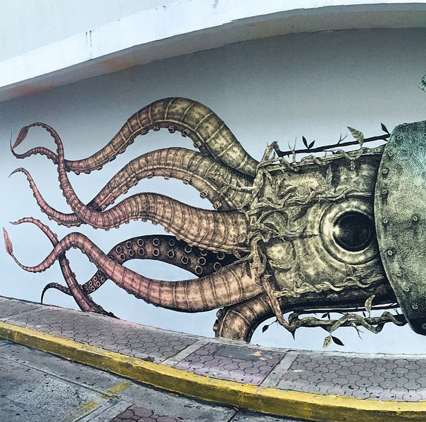 Painting for the excellent Los Muros Hablan ’15 Street Art Festival, the Puerto Rican artist once again delivered an outstanding artwork which is featuring an hybrid whale-squid and a cheeky pelican which may just be the captain of this unusual vessel.