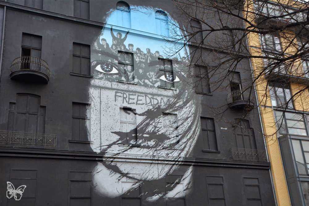 Painting in the cold, Icy & Sot spent the last few days working on this huge facade which has just been completed by the Iranian duo. The result is yet another fantastic stencil-based piece which is showing the portrait of a young girl with the word freedom. Behind her forehead and eye, a crowd of young people seems to be chanting to get ready for action.