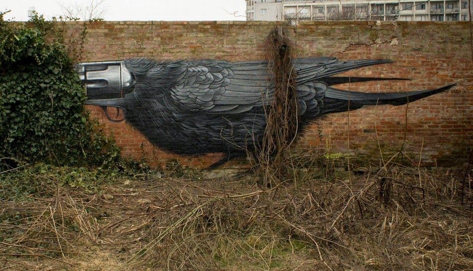 Croatian artist Lonac recently took advantage of a sunny dry weather in his hometown of Zagreb to paint another solid mural. Mixing his impressive skills for producing photo realistic work along with surrealist imagery and distinctive imagination, he created another work involving his “gun bird”.