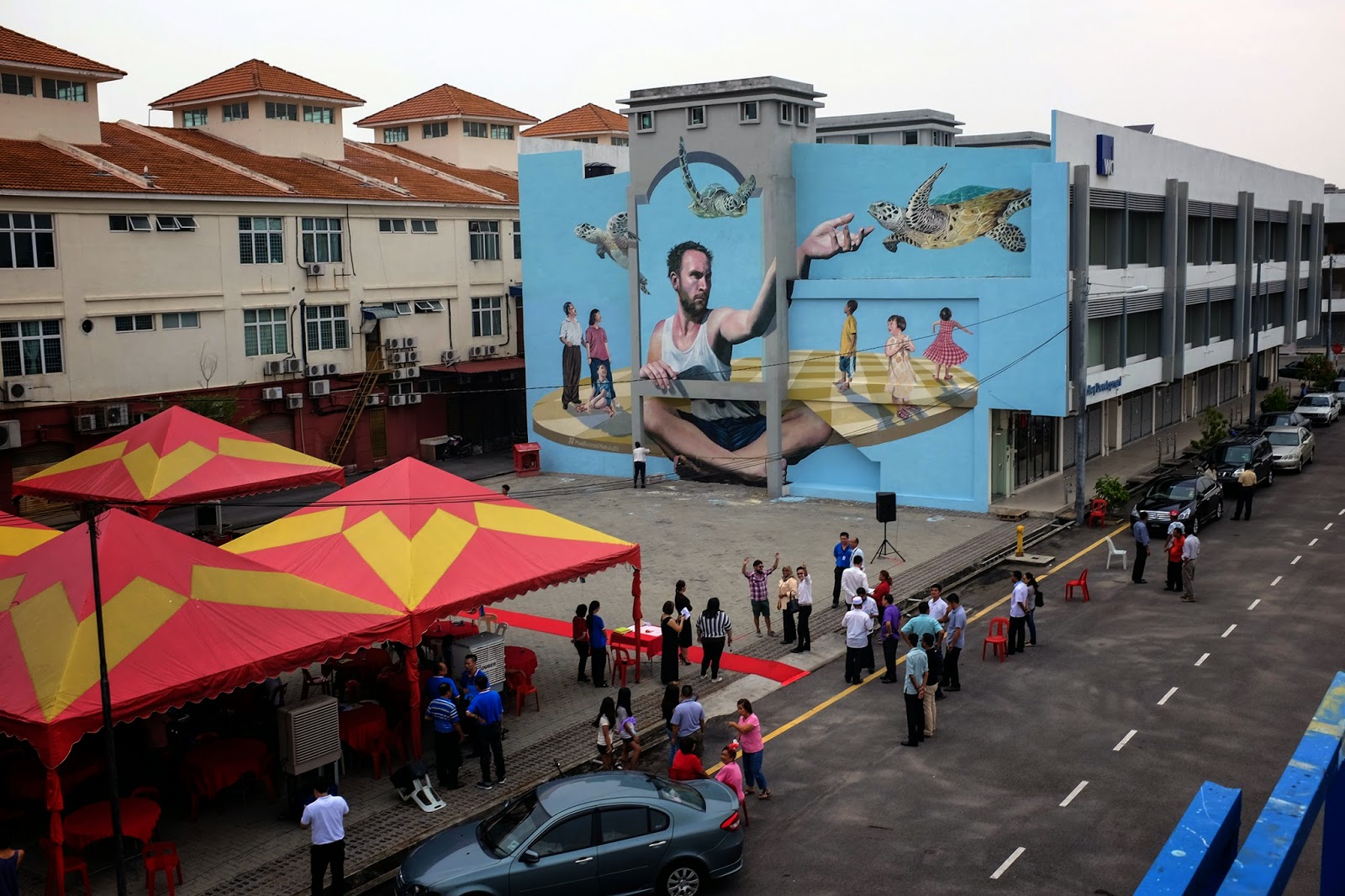 Painting in Raja Uda at the Hin Bus Depot Art Centre, the Argentinean street artist painted yet another impressive hyper-realistic mural. This is to date the largest mural ever painted in Malaysia. The piece is showing an occidental man holding his hand out to feed turtles symbolizing the city’s turtle conservation plan.