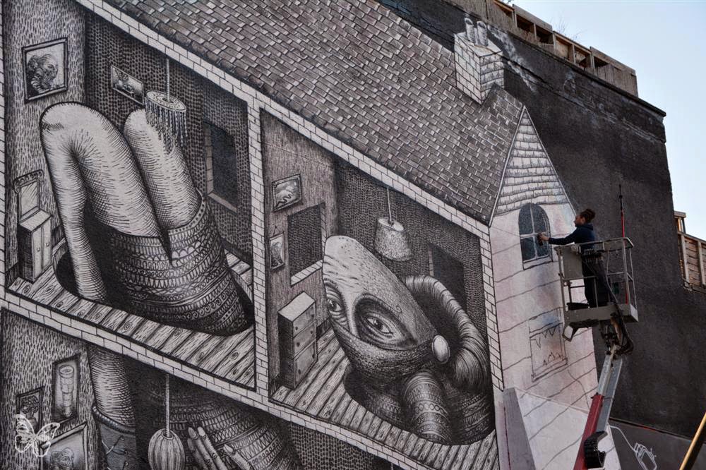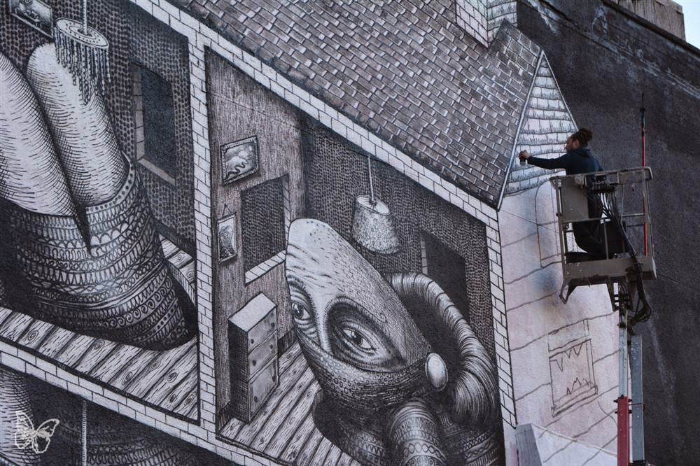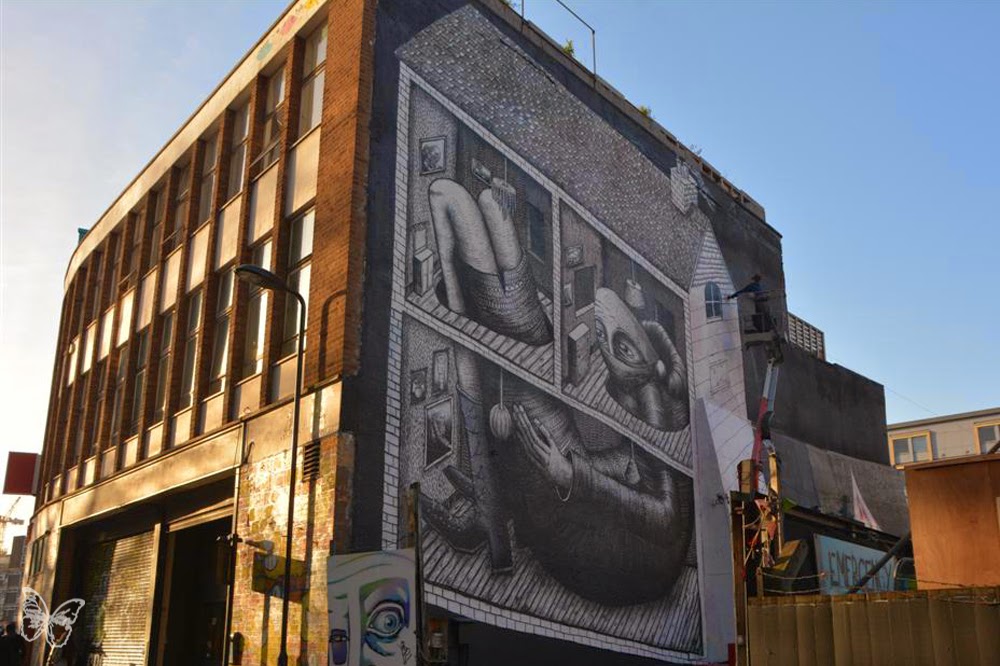 British street artist Phlegm has returned to London where he has been working over the past few days on a news large scale mural in Shoreditch.