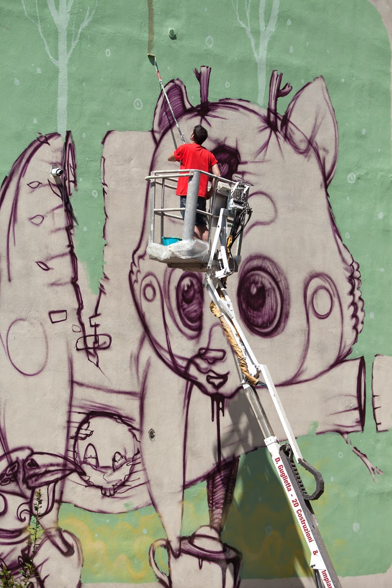 Painting in the district of Tor Pignattara, the Spanish artist brought to life some of his signature imagery for the locals to enjoy. The result is a super cute creature hanging on a brand with his bird buddy.