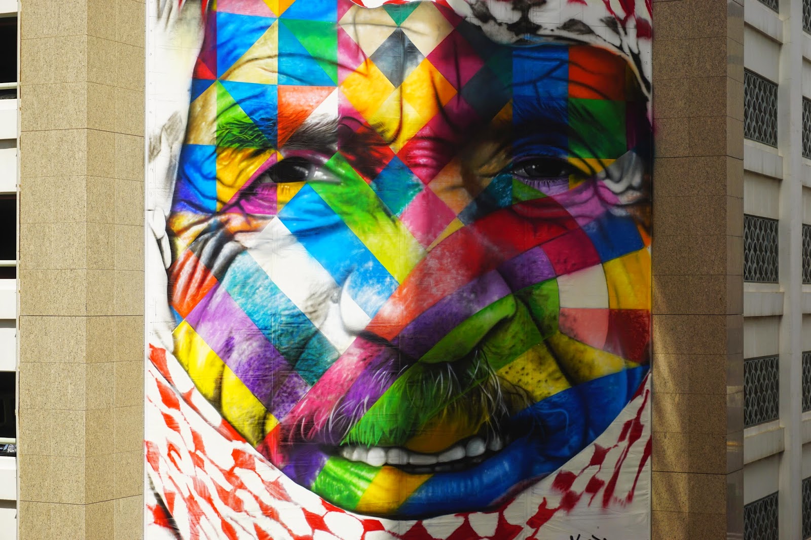 Entitled The Bedouin”, the Brazilian street artist painted this 26 meters high by 11 meters wide building which is now featuring one of signature kaleidoscopic portraits. The Bedouin are an Arab ethnocultural group, descended from nomads who have historically inhabited the Arabian and Syrian Deserts.