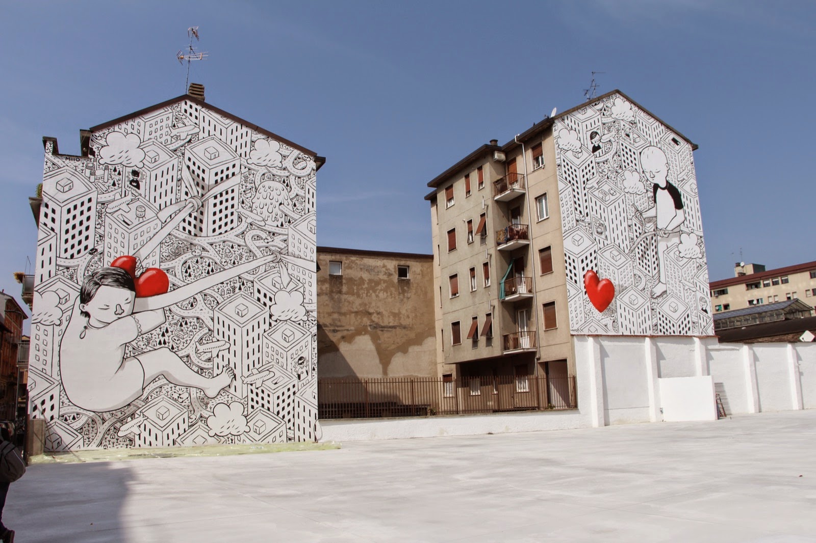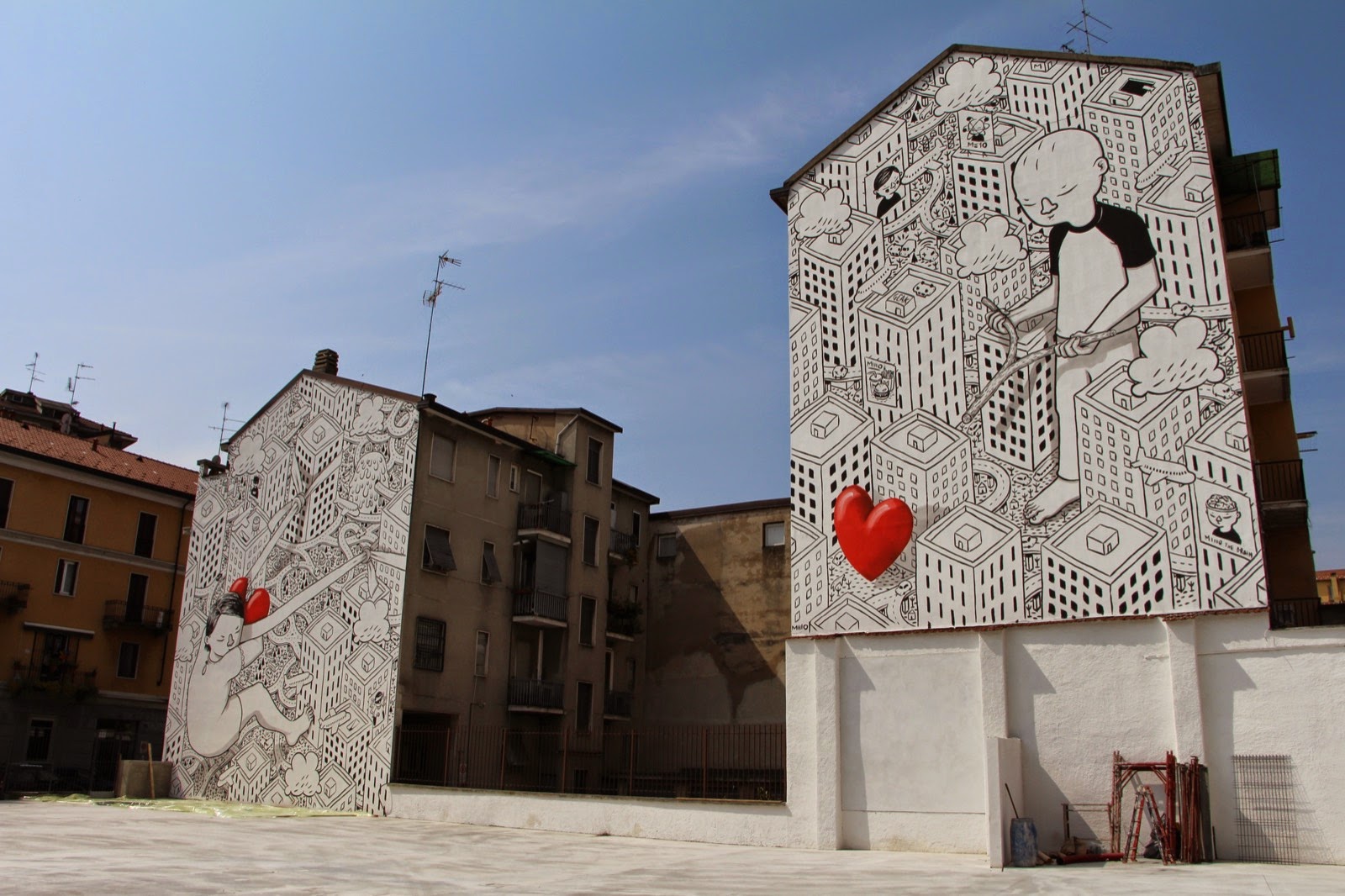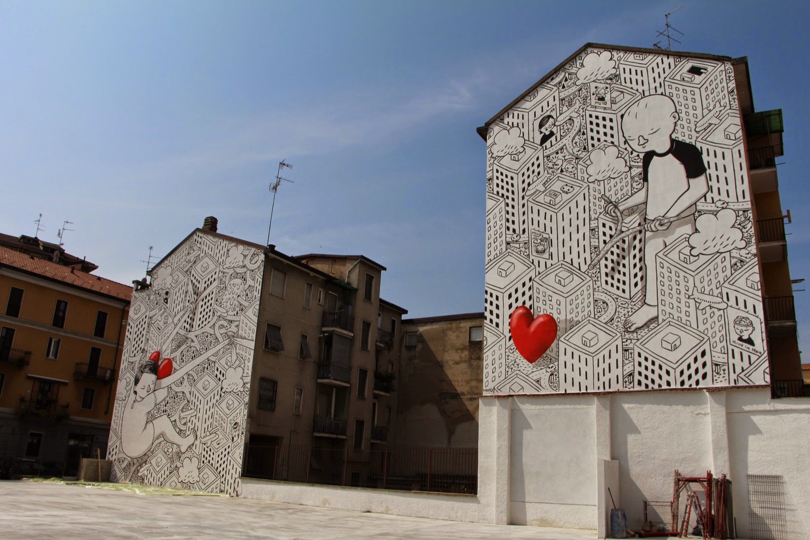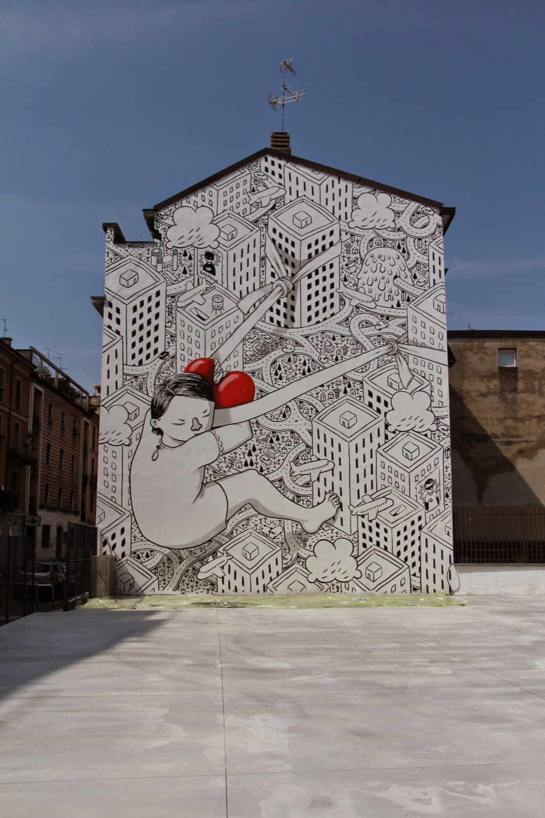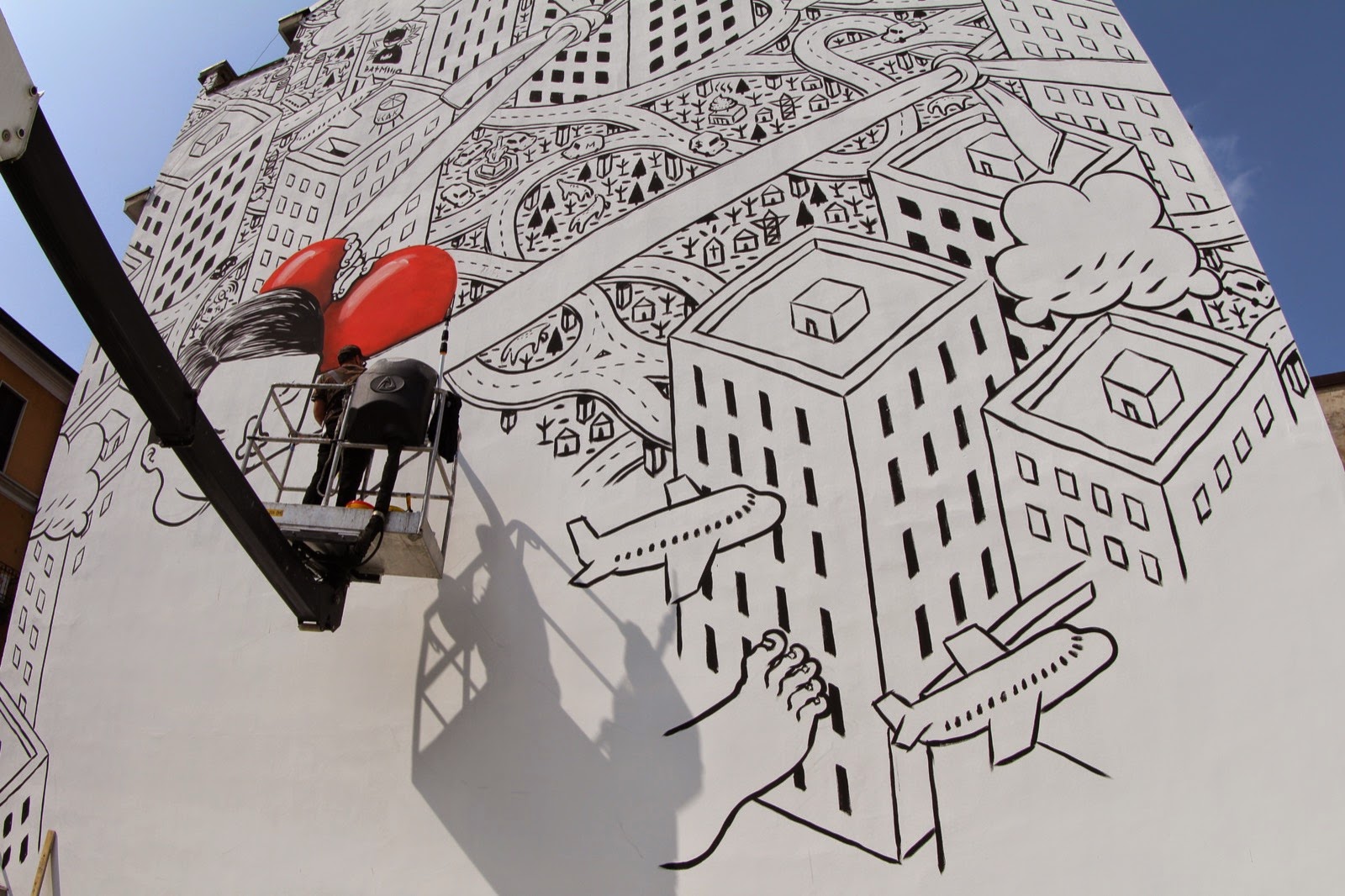 The Italian artist brought to life the second part of “Everyone Is Searching For It” with this massive black and white mural showing one of his whimsical signature characters trying to retain a big red heart.