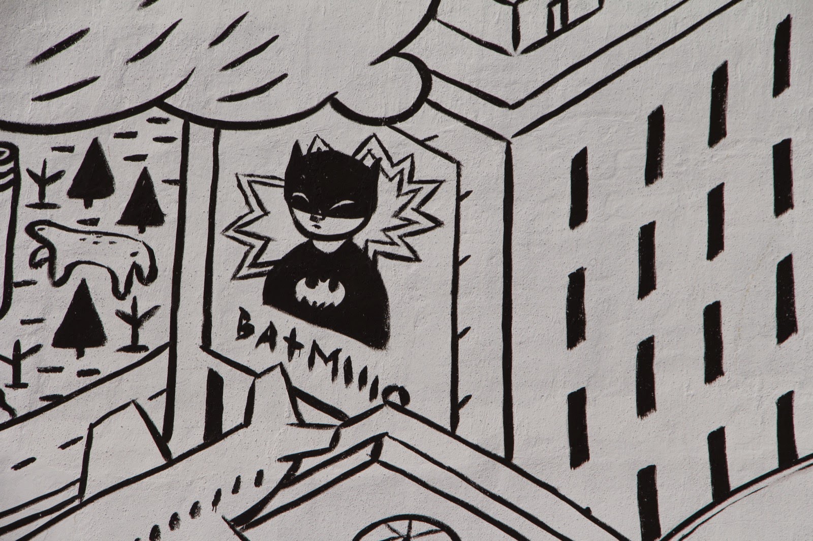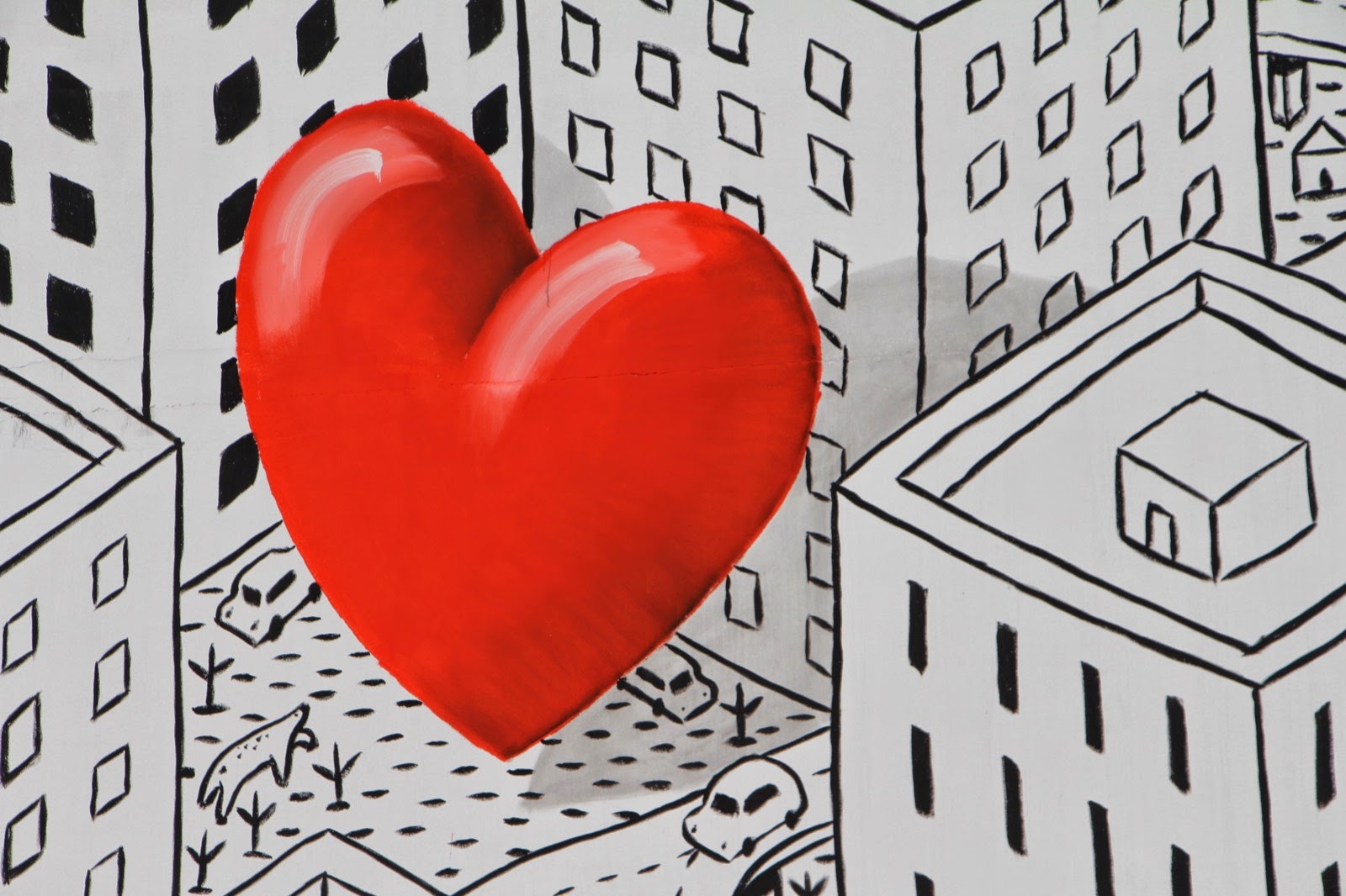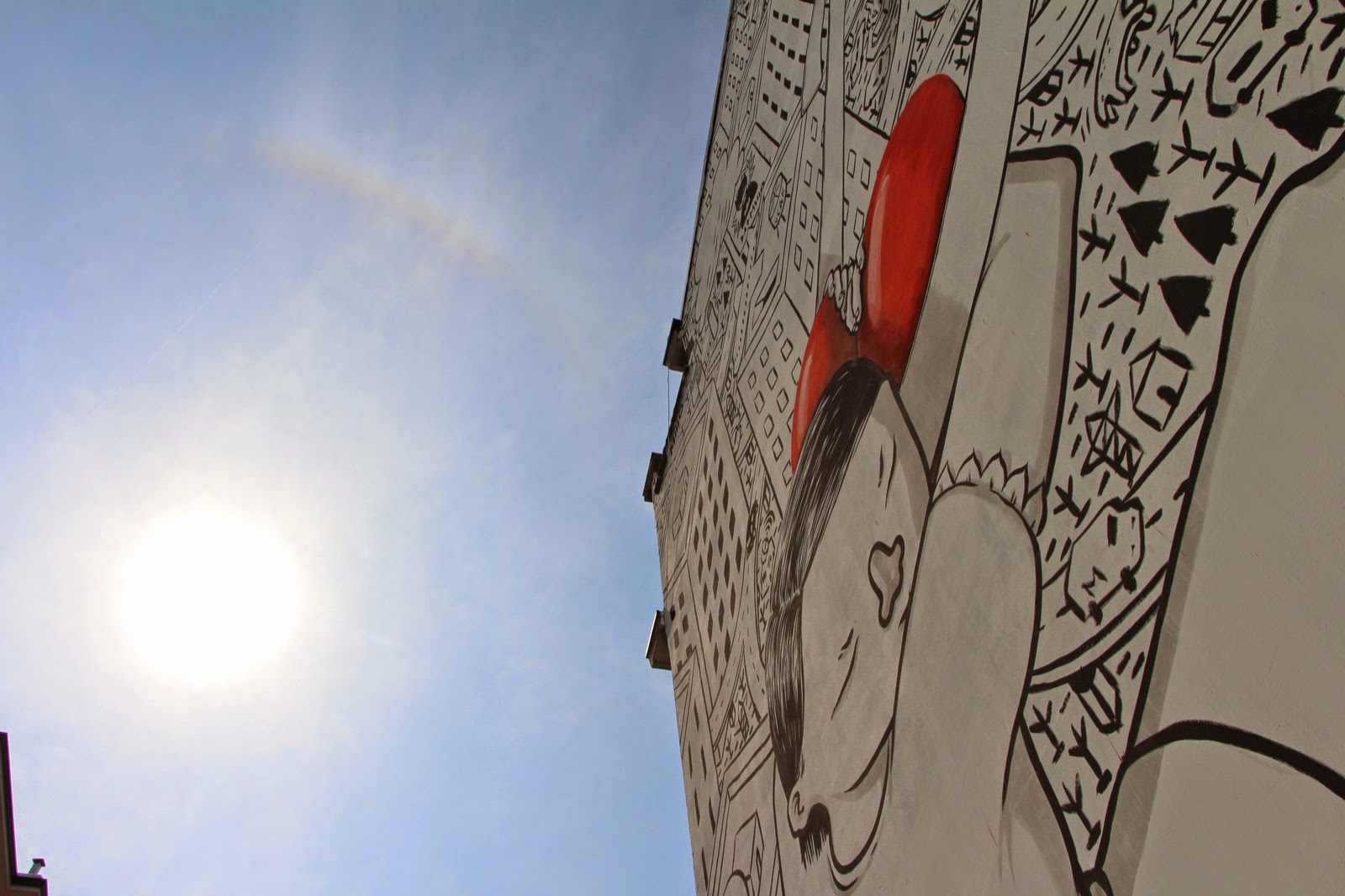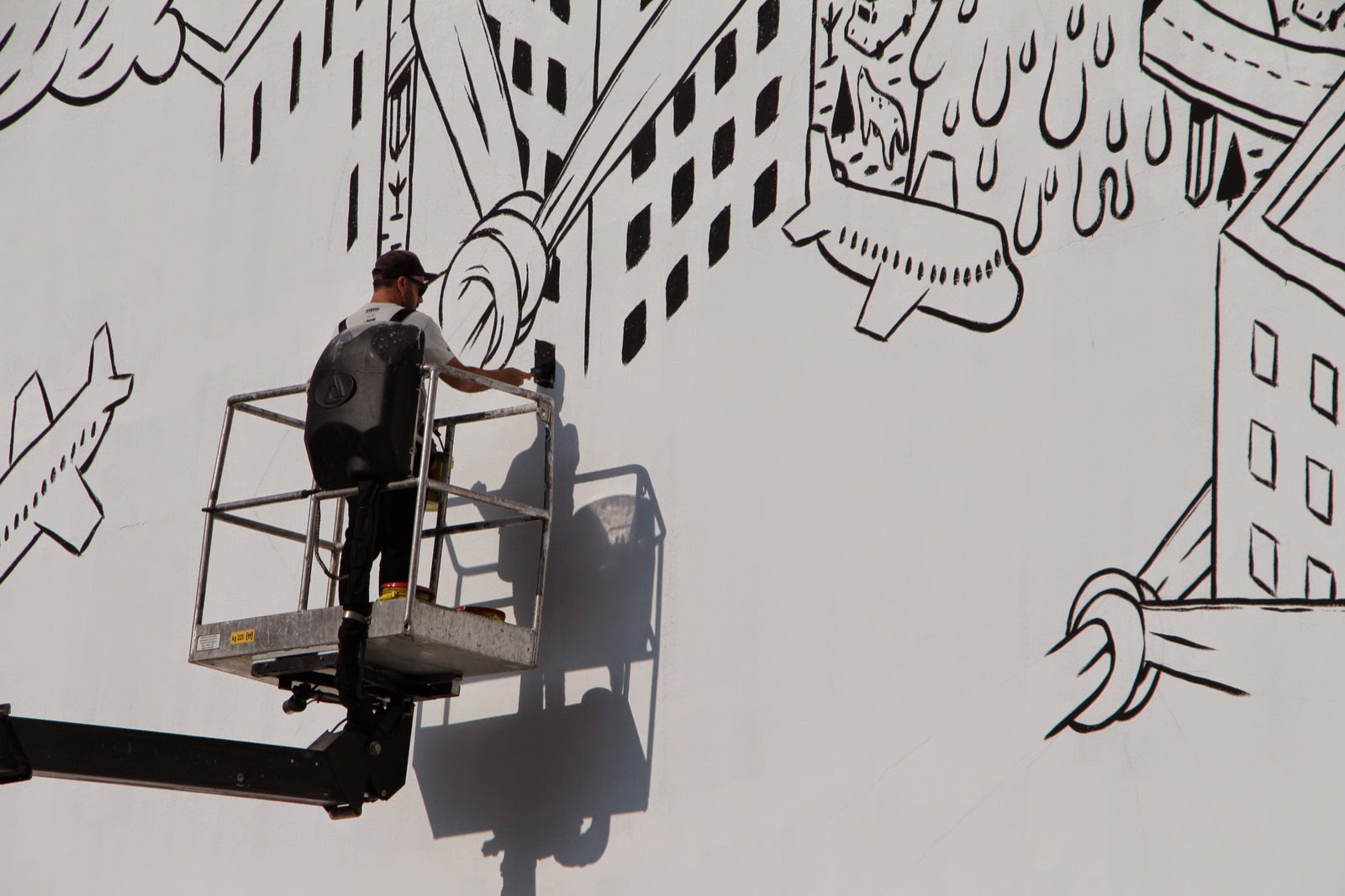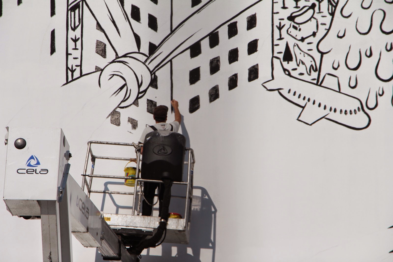 The Italian artist brought to life the second part of “Everyone Is Searching For It” with this massive black and white mural showing one of his whimsical signature characters trying to retain a big red heart.