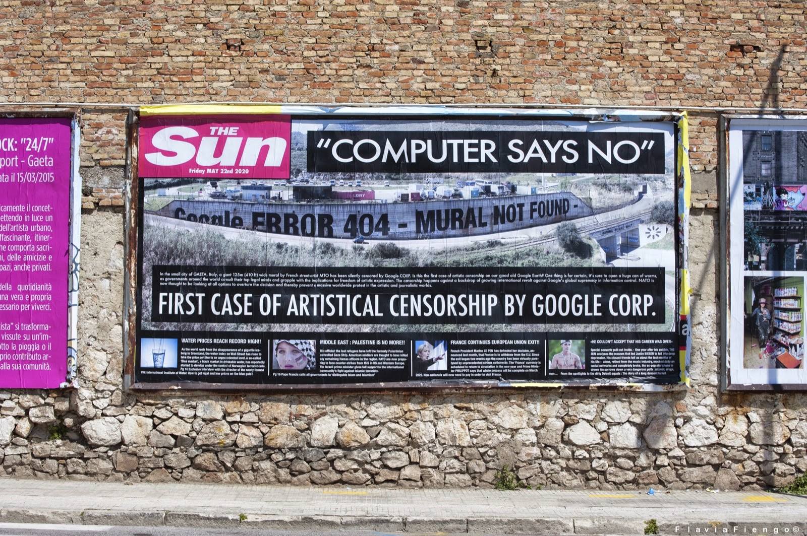 “In the small city of GAETA, Italy, a giant 125m (471 ft) wide mural by French street-artist MTO has been silently censored by Google CORP. Is this the first case of artistic censorship on our good old Google Earth? One thing is for certain, it’s sure to open a huge can of worms, as governments around the world consult their top legal minds and grapple with the implications for freedom of artistic expression. The censorship happens against a backdrop of growing international revolt against Google’s global supremacy in information control. NATO is now thought to be looking at all options to overturn the decision and thereby prevent a massive worldwide protest in the artistic and journalistic worlds.” — MTO