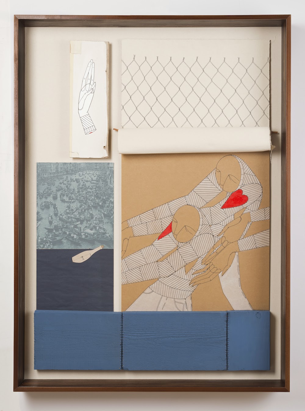 The exhibition “Water Takes the Shape of its Container” presents about twenty previously unseen pieces, assemblages of paper, wood and photographs, and an installation.