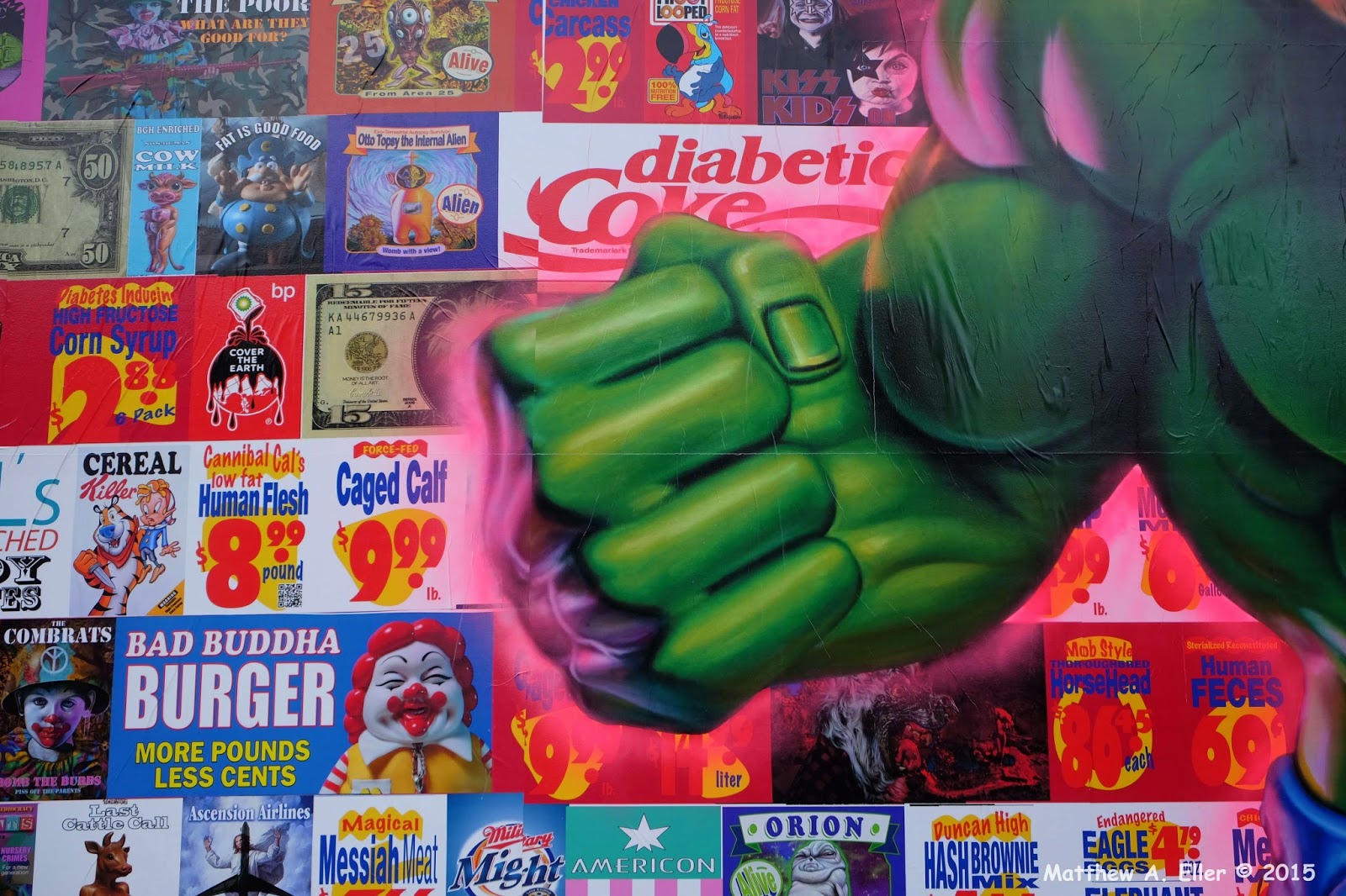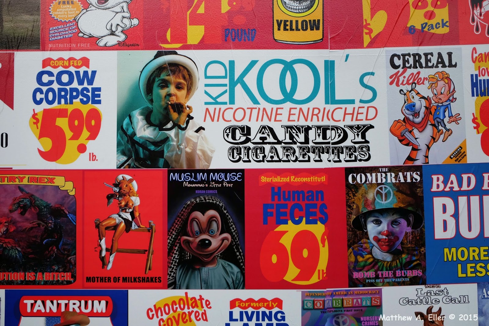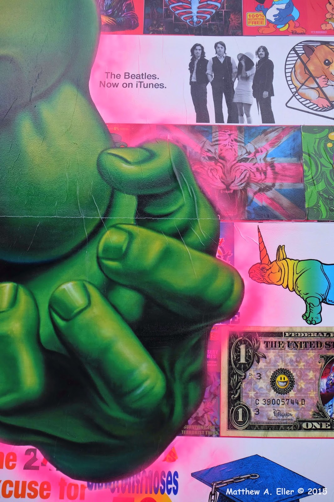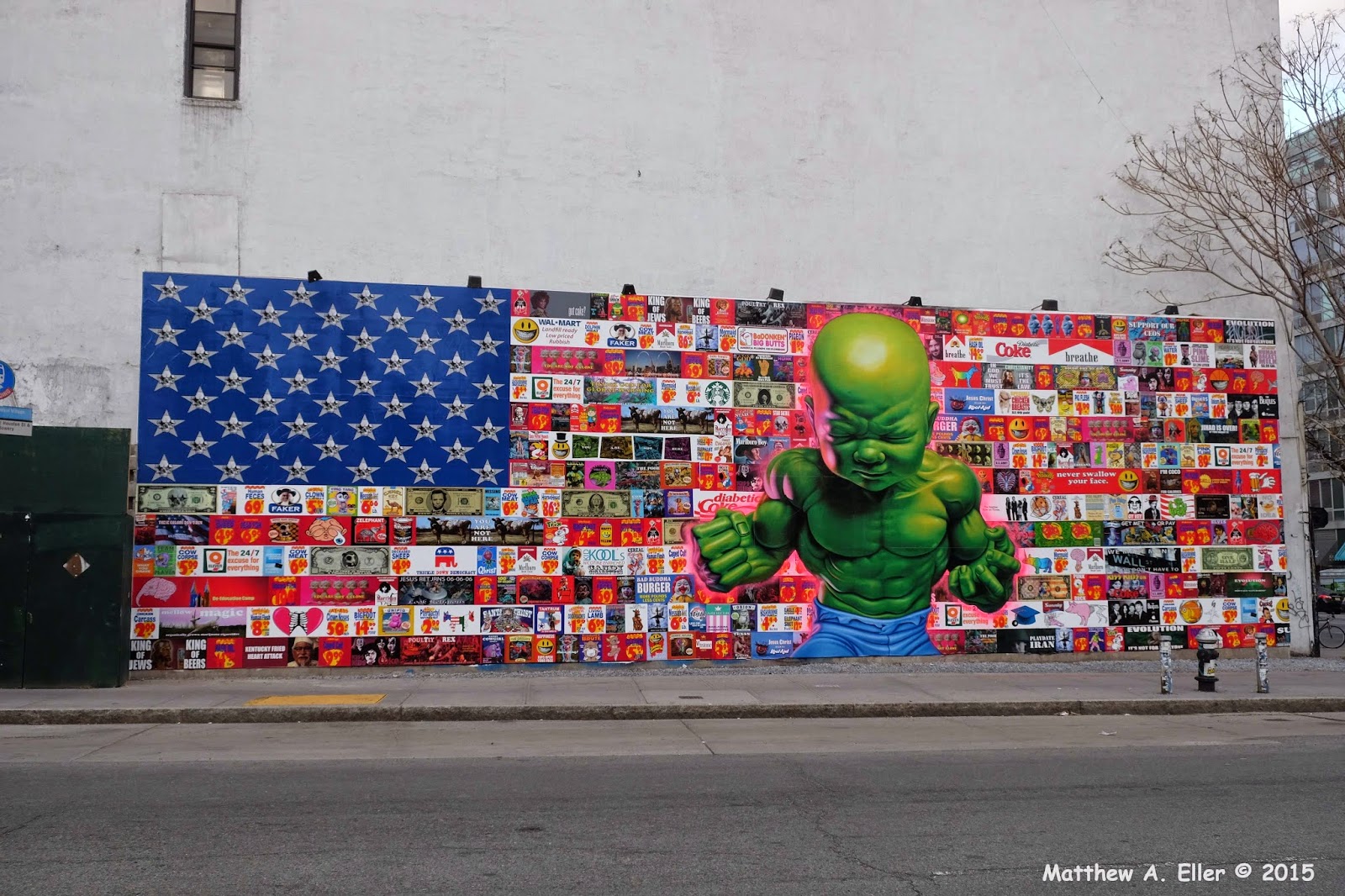 There is not much to say about Ron English other than he is a living legend. The godfather of the billboard takeover, creator of countless satirical and iconic figures that are the epitome of what “street art” was, is, and will always hope to be. I have had the pleasure over the past couple years to chat with Ron about intellectual property law and street art, and all I can tell you is that he has spent more time arguing IP cases in front of judges then I have ; ). Ron has blessed NYC once again with a stunning new piece at the famed Bowery Mural Wall located at Bowery & E. Houston featuring a “Temper Tot” mid rage pasted over a mosaic of an American flag comprised of every Ron English work you could ever imagine. The piece acts almost like a “best of” or “Idiots Guide” to the revolutionary body of work that is Ron English. Check out the pictures below and make some time to see it in person if it is in any way physically possible!