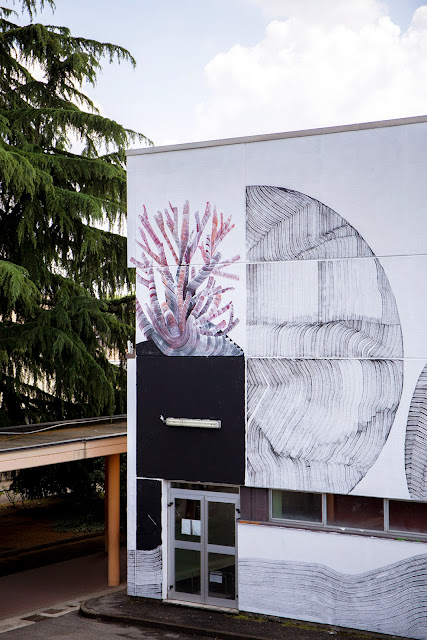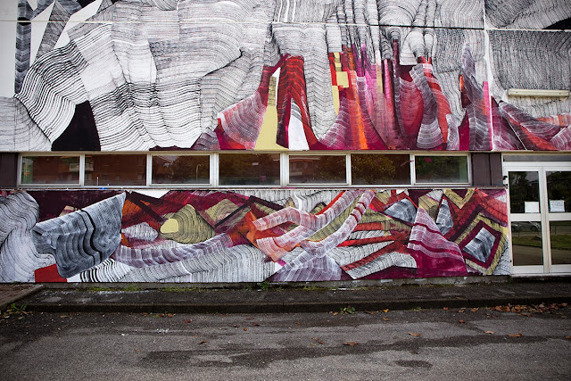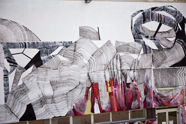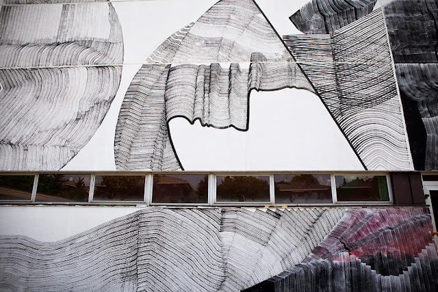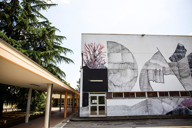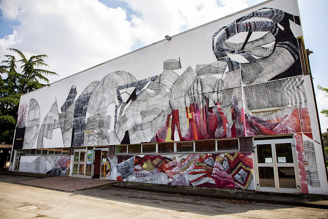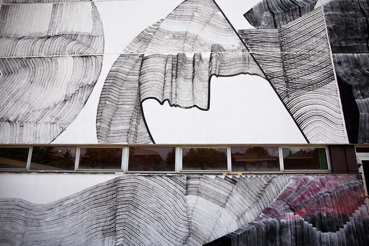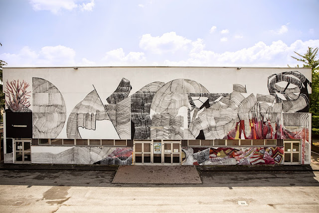 The Milan-based painter spent a few days working on this massive building which is now featuring some of his signature line-based abstract imagery. For the first time ever, 2501 used a new technique of juxtaposing colors and texture.