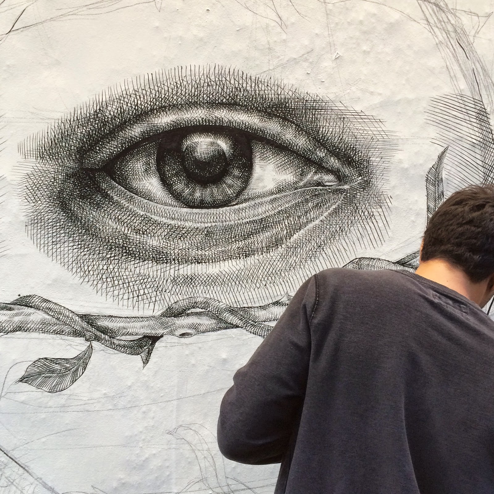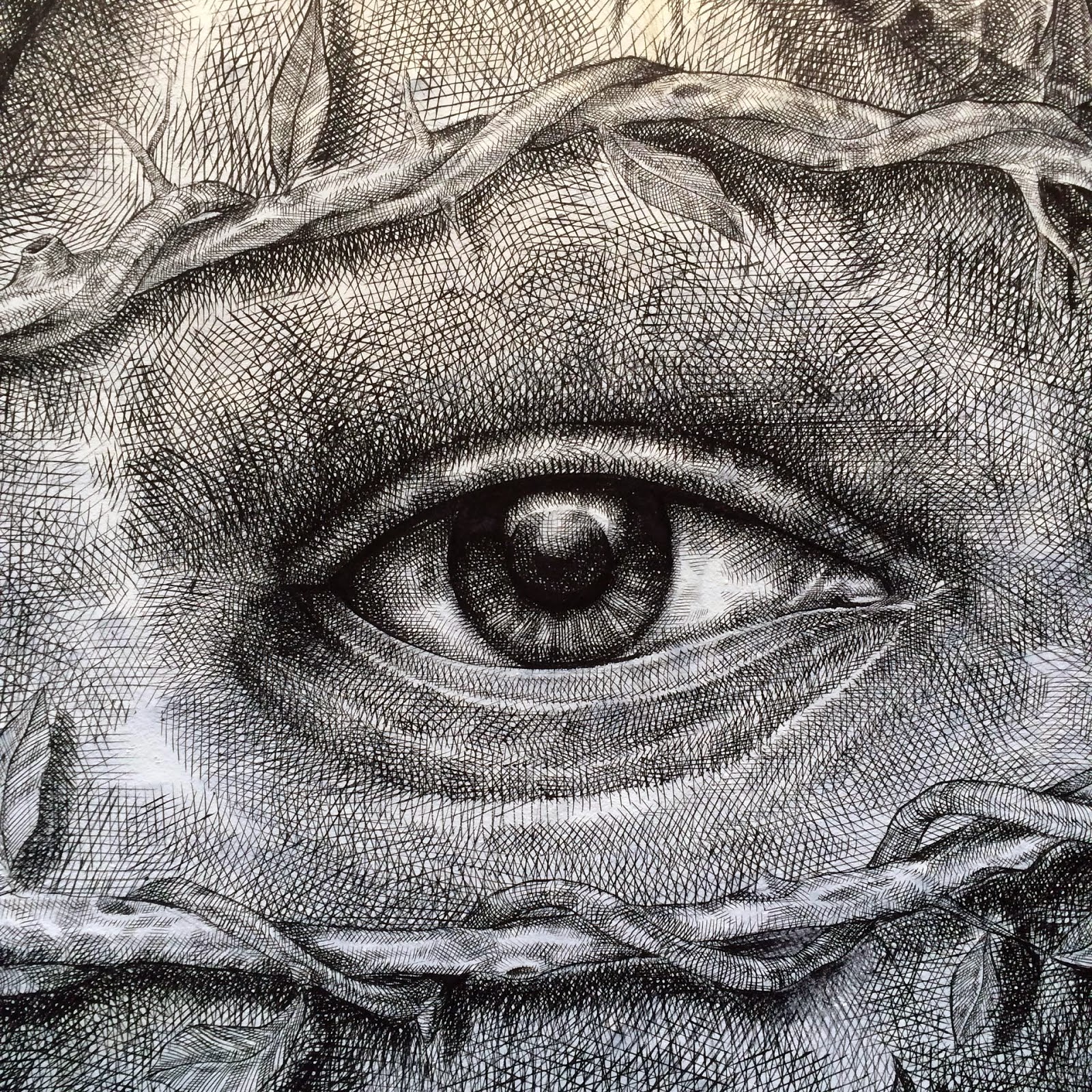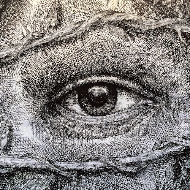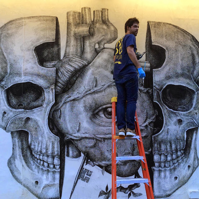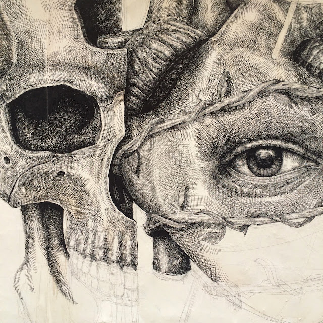 Geared with his tiny brushes and china ink, the Puerto Rican artist once again went through the tedious process of painting a million tiny lines to create this stunning piece of work. The image shows a skull split in two which is revealing an eyed-heart that is torned by roots and pierced by a key.